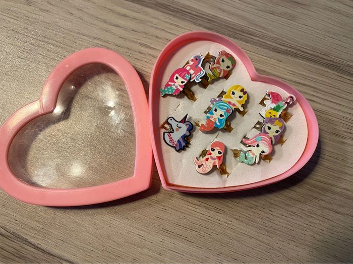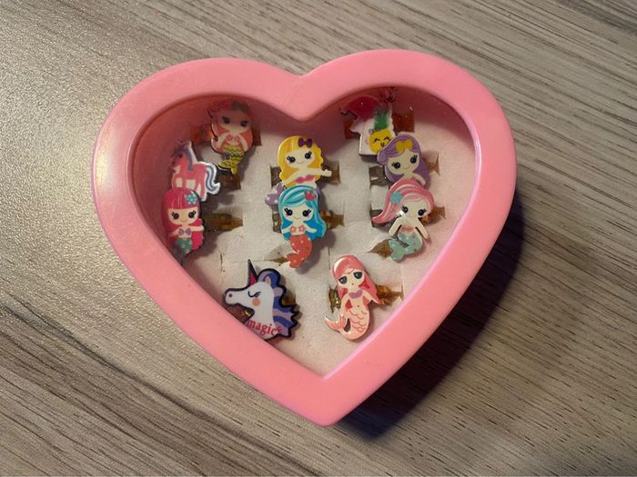 Boîte coeur porte bagues avec 10 bagues sirènes et licornes ajustable - photo numéro 1