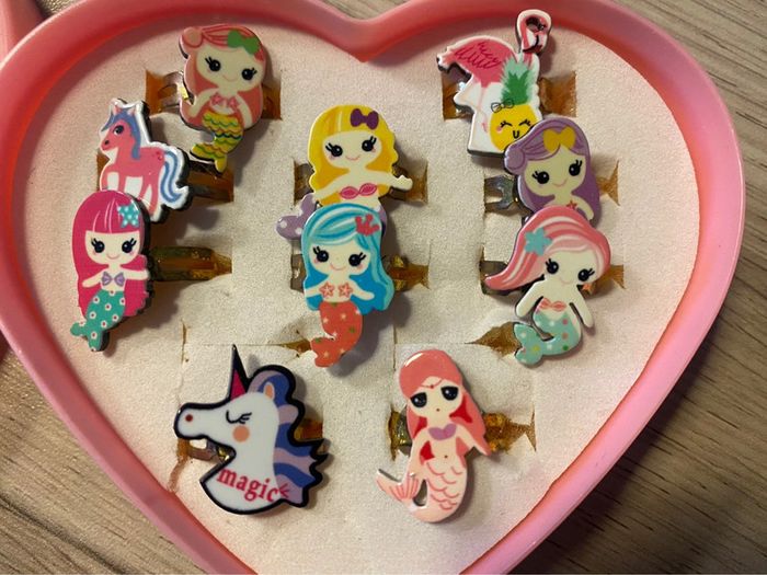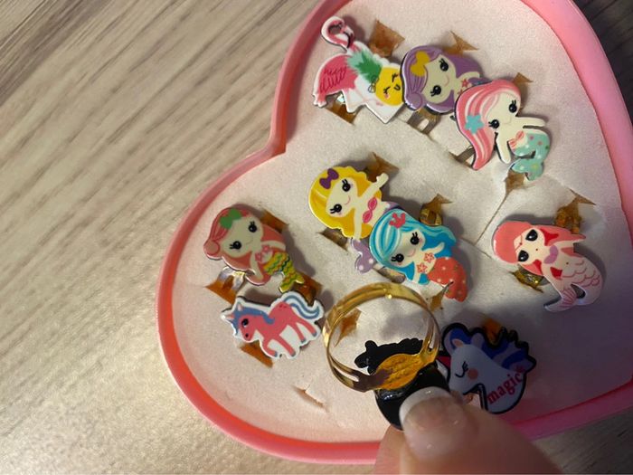 Boîte coeur porte bagues avec 10 bagues sirènes et licornes ajustable - photo numéro 4