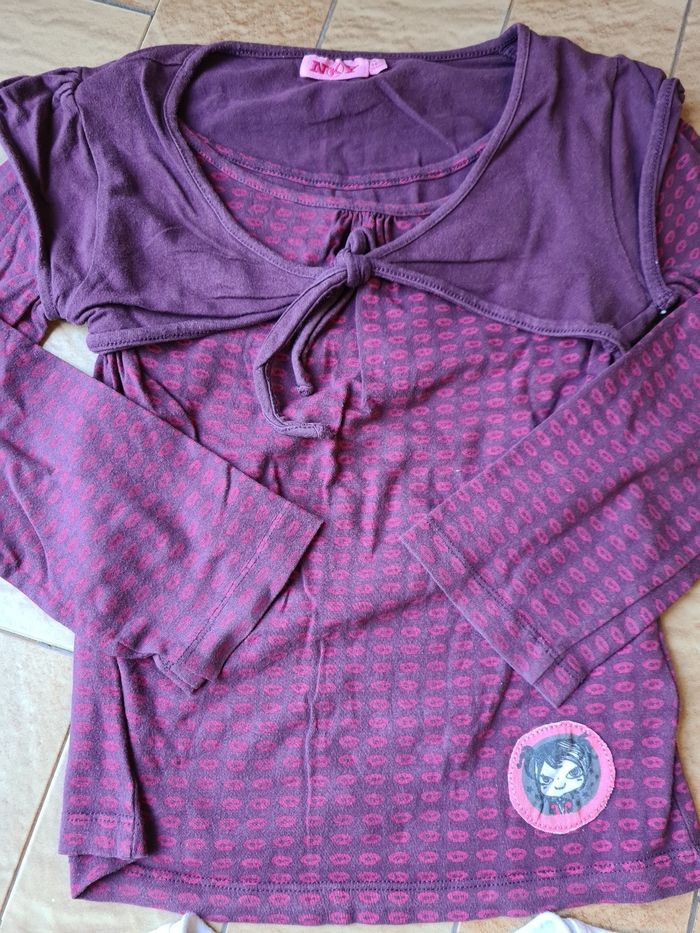 Lot de 2 t shirts manches longues comprenant : 1 t shirt violet, noeud sur le devant 1 t shirt gris clair et blanc, motifs sur le devant Le tout en très bon état Taille 8 ans Possibilité de remise en mains propres sur Maurepas