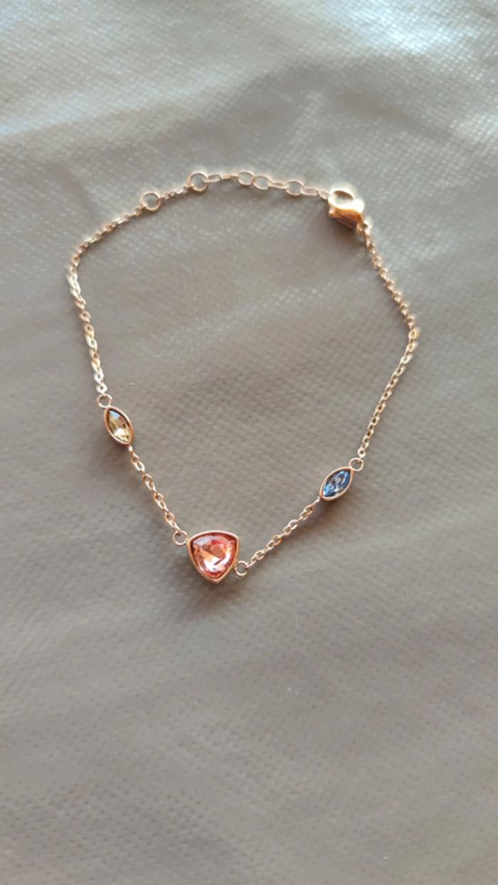 Bracelet en acier ionisé or rose, composé d'un chaînage fin avec 3 zirconias Preciosa aux couleurs aquarelle topaze, sapphire et rose. La forme "coussin" inhabituelle à trois côtés de la pierre centrale donne un cachet resplendissant au bracelet. Les deux zirconias taille marquise ajoutent une touche supplémentaire d'élégance. A noter l'insertion subtile dans la chaîne d'un anneau à 17cm pour les plus petits poignets. La couleur rosée du métal renforce la douceur visuelle que procure ce bracelet. Sans nickel et sans allergène. Prix catalogue : 74,90€ NEUF vendu dans son sachet d'origine.