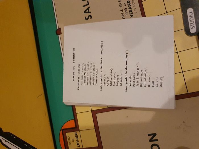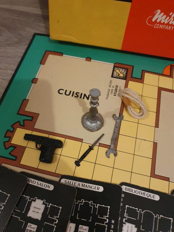 Jeu de société Cluedo. Abîmé car assez ancien (voir photos notamment boîte ou carte). Il manque la matraque et les pions (pions classique trouvable facilement), il reste où deux feuilles mais je m'engage à en réimprimer, sinon complet. #jeu #jeux #jeudesociete #jeudeplateau #cleudo #miro #jeudenquêtes #crimes