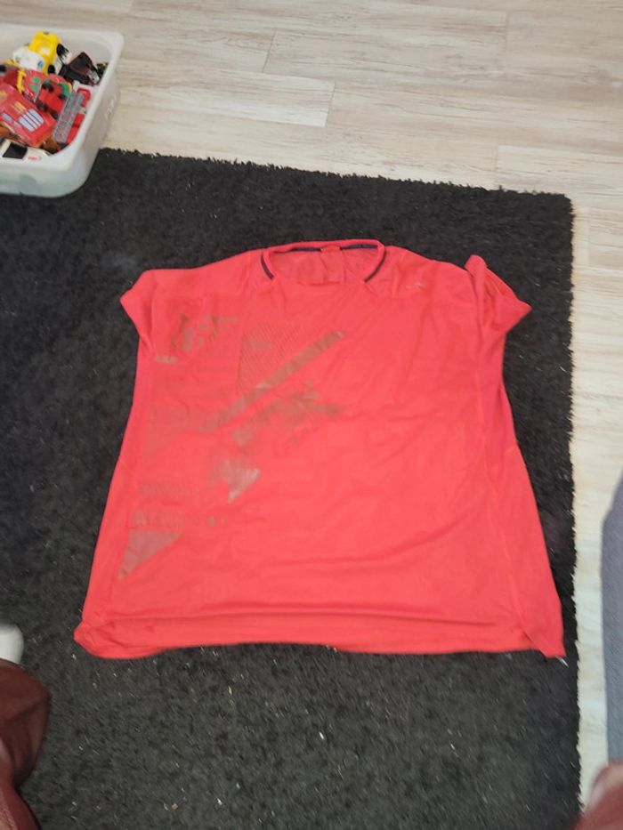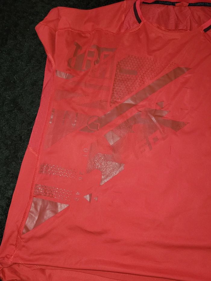 Tee-shirt manches courtes rouge et motif devant. Il n'y a plus l étiquette mais il est en matière respirante pr le sport. Lavé avant envoi. Si possible choisir Mondial Relay pour l'envoi. #teeshirtmanchescourtes #teeshirthomme #domyos #2xl