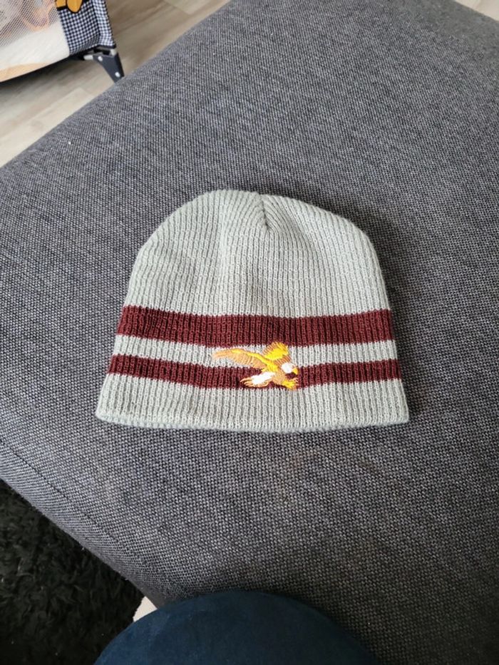 Bonnet gris er bordeaux motif aigle. Il n'y a pas ni la taille ni la matière à l intérieur. Je dirai 3.4 ans. Lavé avant envoi. Si possible choisir Mondial Relay pour l'envoi. #bonnetgarçon #hiver #petitprix