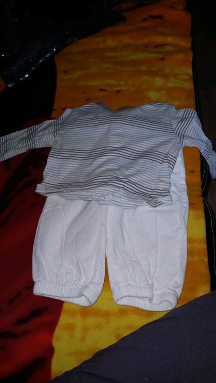 Ensemble 2 pièces : pantalon velours blanc et tee shirt rayures. Tous les vêtements sont lavés avant envoi. Faites des lots il y a plein de fringues bébé dans mon dressing.