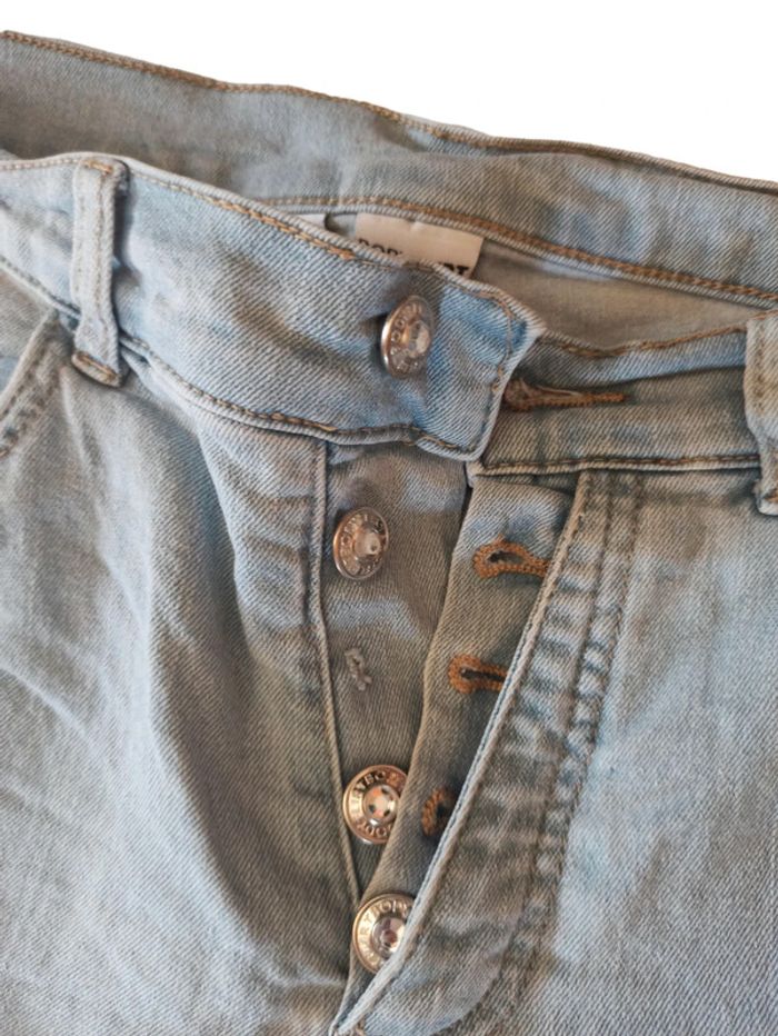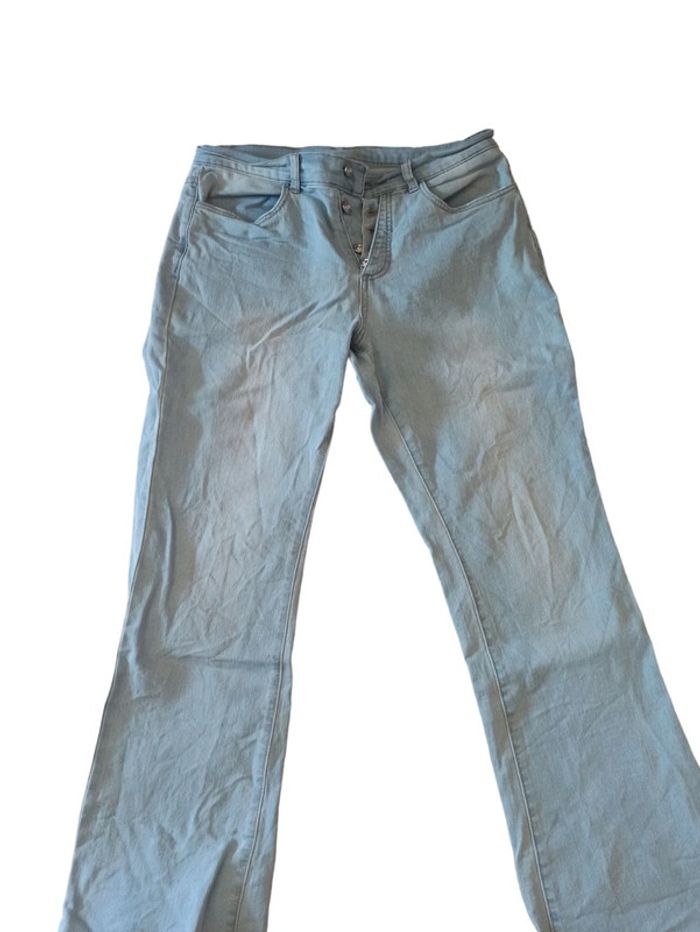 Jean bleu clair taille 44 Il manque un bouton voir sur la photo jointe 78 % coton 20 % polyester 2 % élasthanne