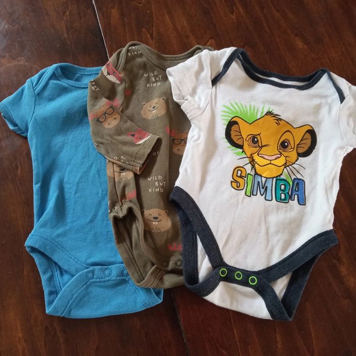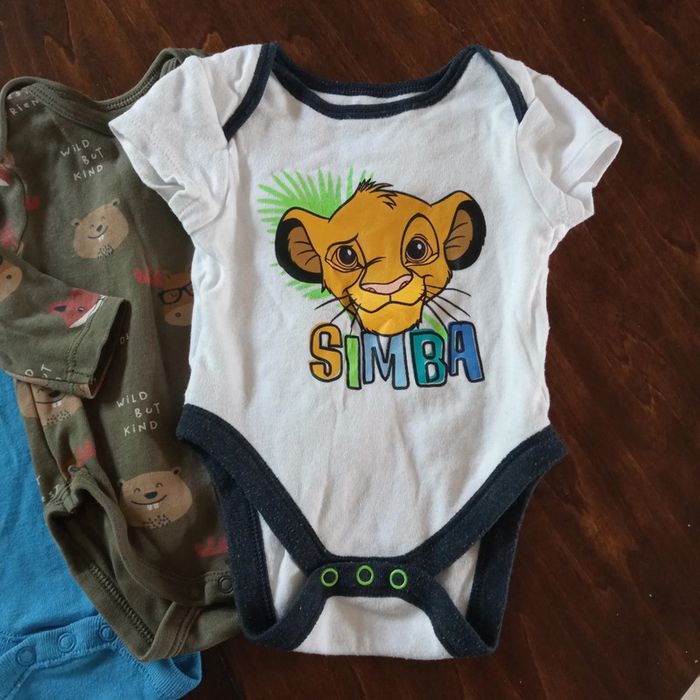 Lot de 3 bodies manches longues et courtes 3 mois 1 Hema sympa et original 1 Disney le Roi Lion 2 bleu uni sans marque En bon état Réduction sur les lots