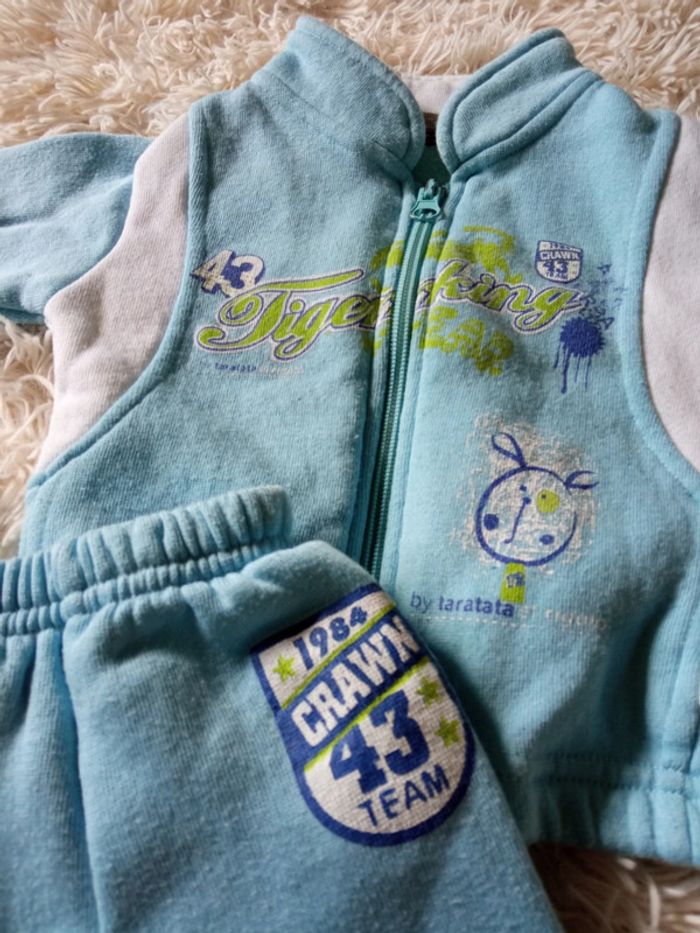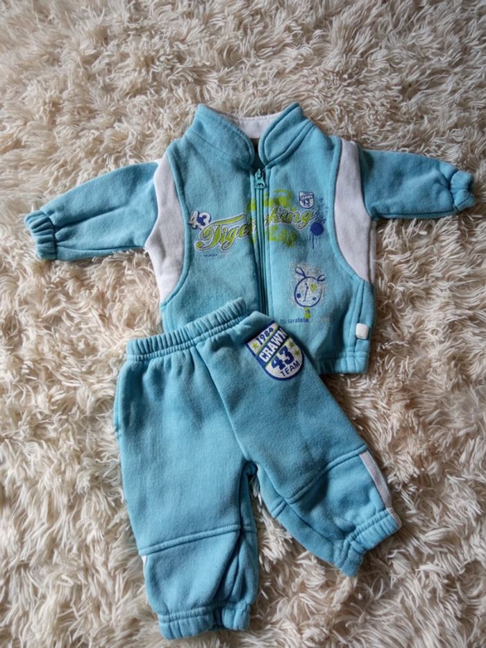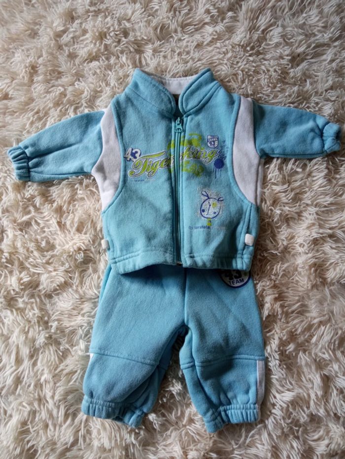 Ensemble jogging survêtement comprenant veste zippée et pantalon assorti, noté 6 mois mais correspond à du 3 mois. Bleu clair et blanc. Réduction sur les lots