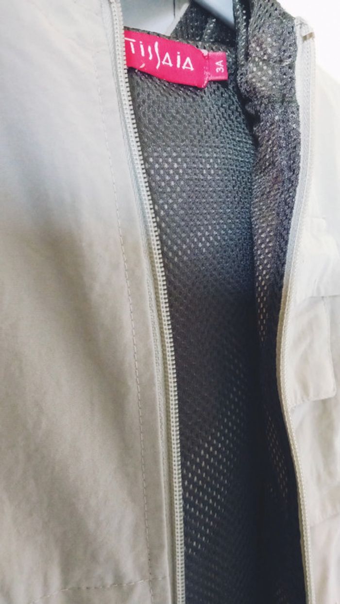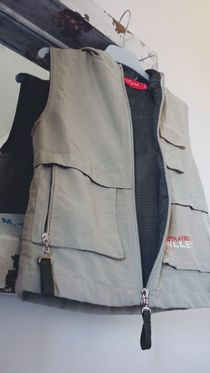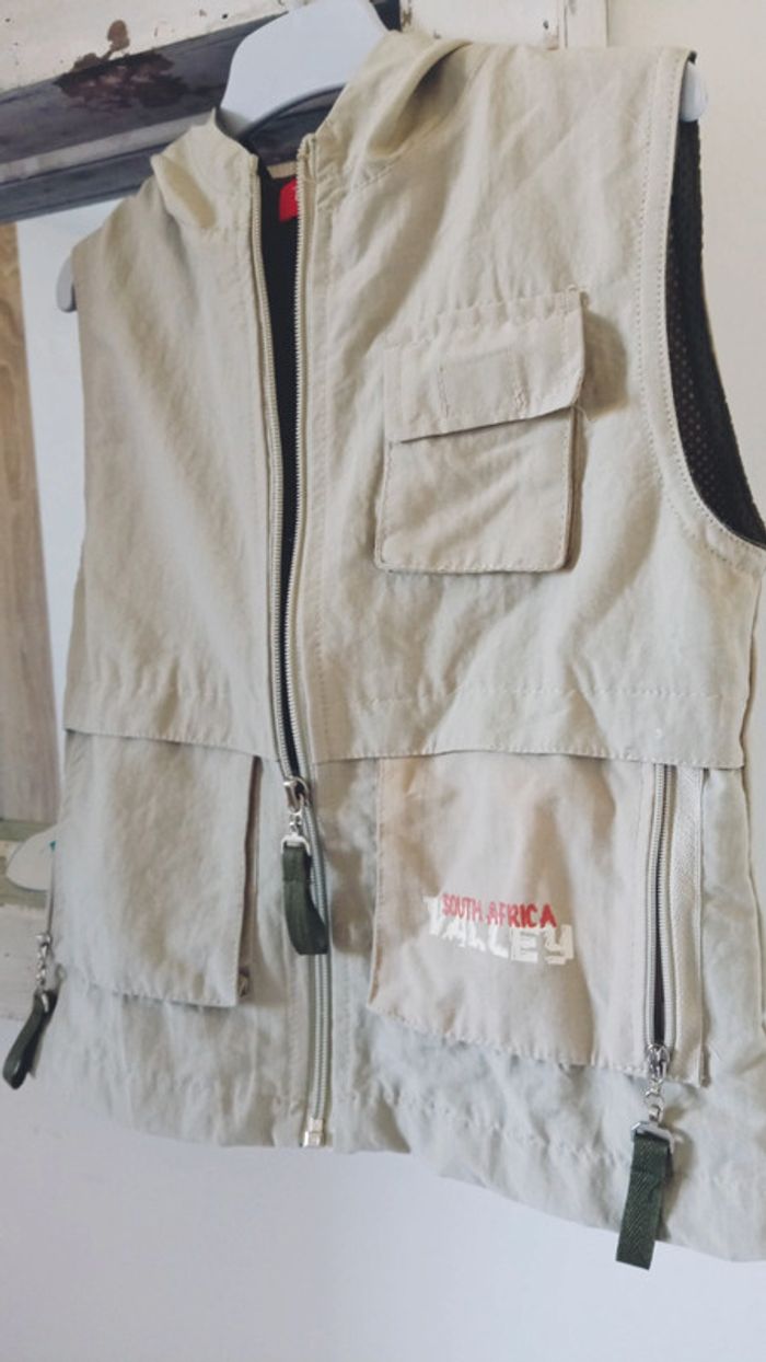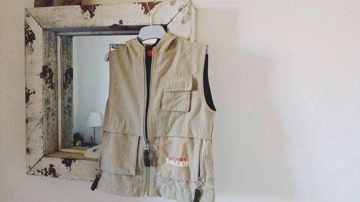 Gilet/veste/kway zippé sans manche, style aventurier, sport, randonnée, avec capuche, plusieurs poches zippées. Couleur beige/kaki clair. Plutôt en très bon état. Marque Tissaia Réduction sur les lots