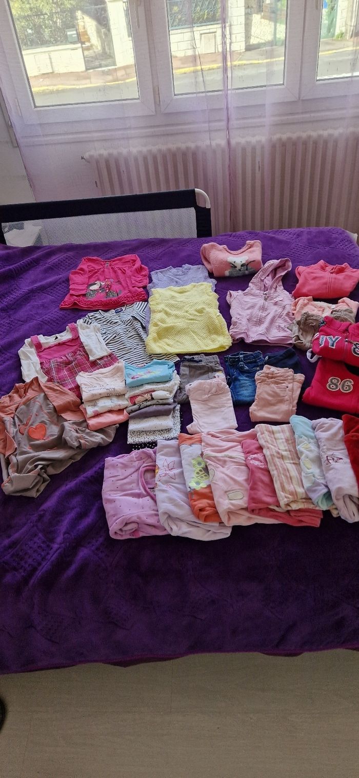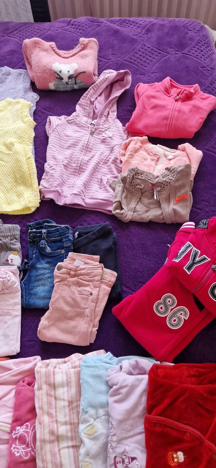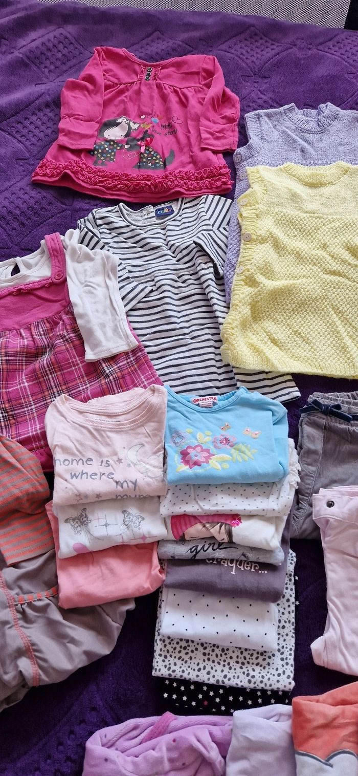 Gros lot vêtements fille 12 mois 6 robes 1 gros pull 4 Gillets 1 survêtement haut et bas 5 pantalons 11 t-shirts manches longues 9 pyjamas Tout les vêtements sont en très bon état il y a juste des petits trous sur certains pyjamas voir photos Plusieurs marques zara baby girl, orchestra, Du pareil au même, primark,lupilu, kitchoun, young dimension, tex baby...