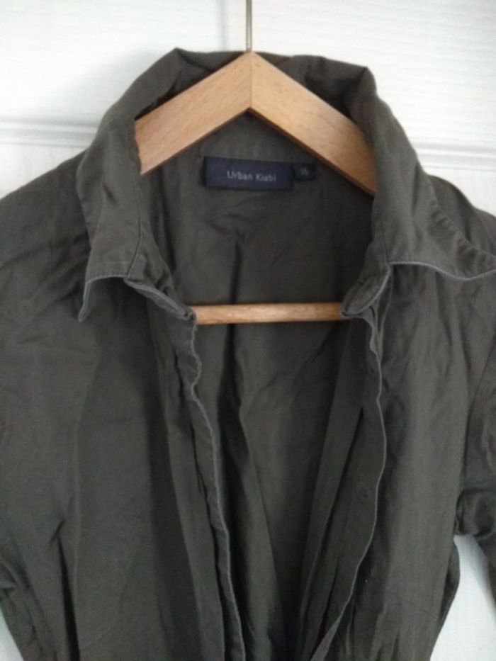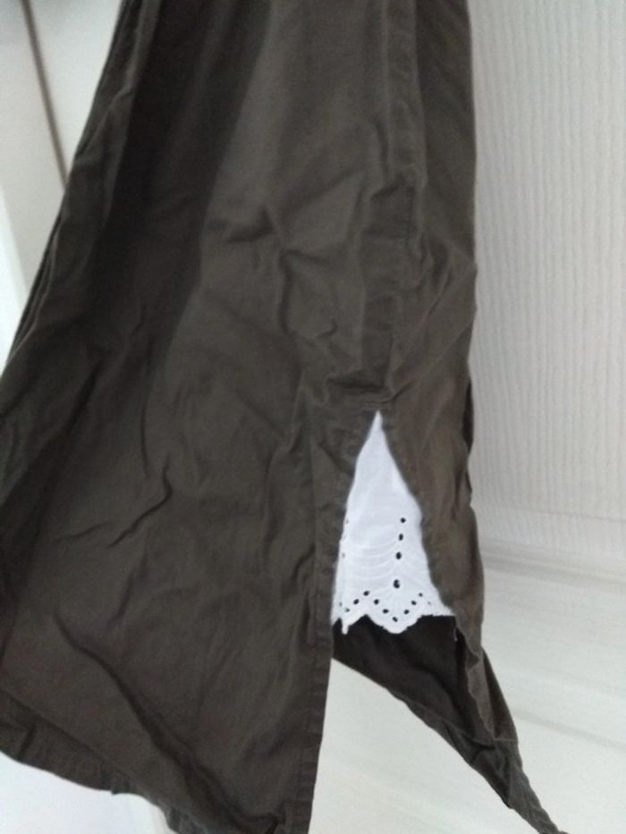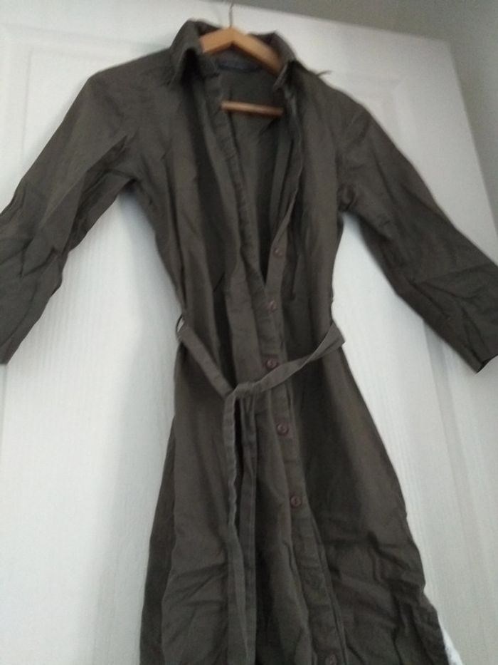Robe à boutonnière kaki - Taille 36 Arrive à peu près au genou (je fais 1.57m) Echancrée sur les côtés (j'y ai mis de la dentelle car je trouvais que c'était trop échancré). Avec ceinture. Froissée mais en très bon état