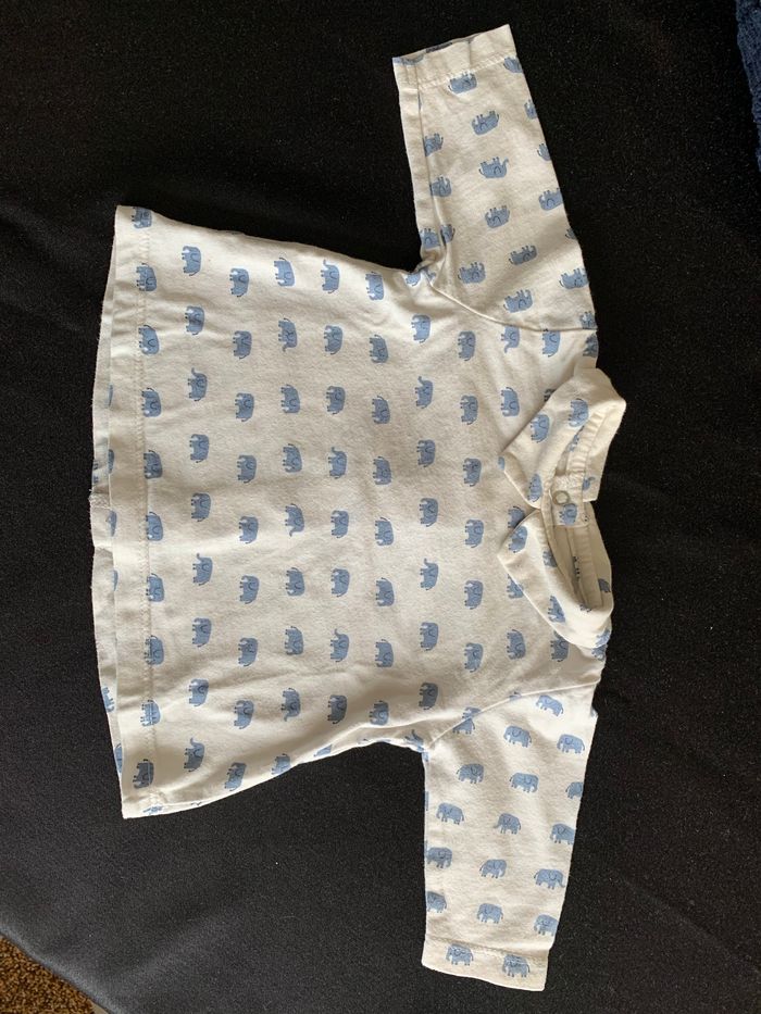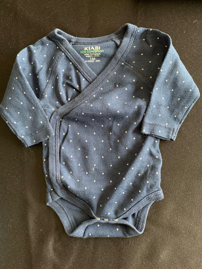 L’ensemble comprend pour 1 mois : * 1 gilet bleu marine Kiabi avec 2 poches devant et col remonté * 1 t-shirt Bout’chou manches longues blanc avec impression éléphants 🐘 bleus et petit col (légèrement jaunâtre et mini tâche derrière) ouverture derrière par boutons pression * 1 body Kiabi bleu marine petites étoiles blanches * 1 body Les chatounets bleu clair avec dessin devant chaussures blanches (le bout de l’une des 2 manches est un peu jaunâtre)