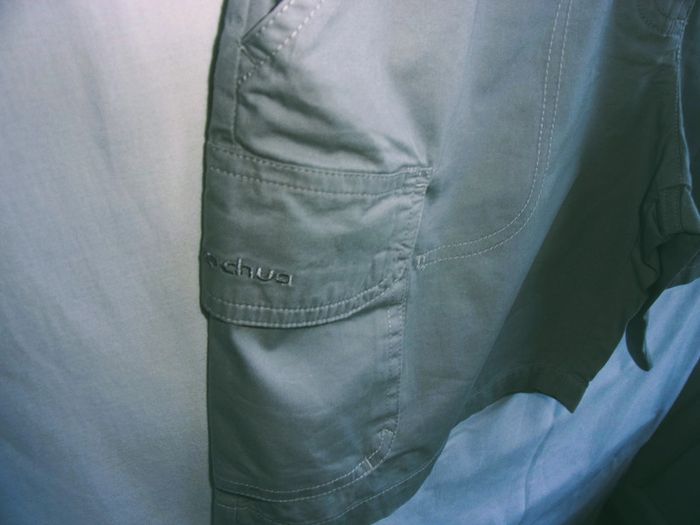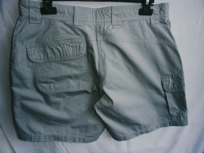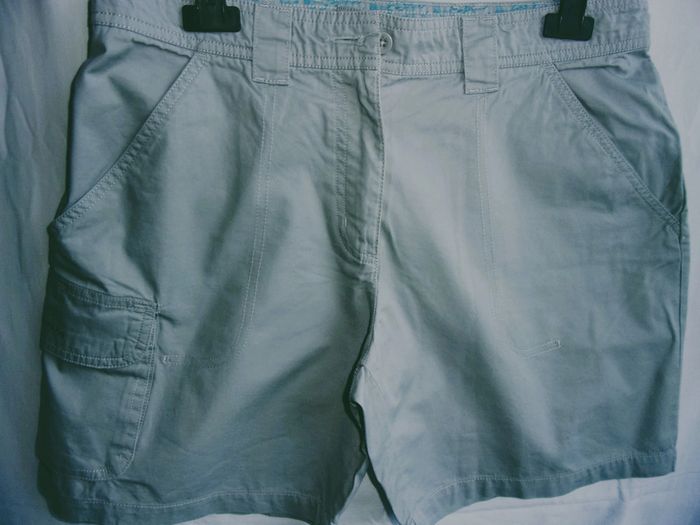 Short QUECHUA - T.40 Couleur gris/vert d'eau 2 poches + poche à soufflet et rabat Au dos une poche plaquée à rabat 100% coton Doublure ceinture fleurie Excellent état.. comme neuf