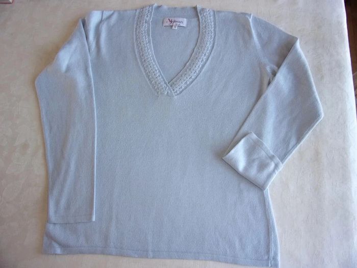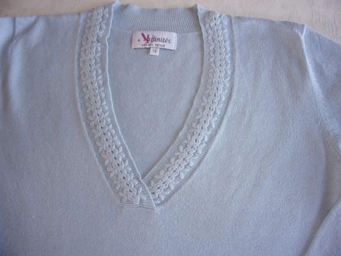 Joli pull avec col V - t.2 Affinités Couleur bleu ciel Bordure du col brodée 40% coton 30% viscose 20% polyamide 10% angora