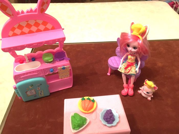 Poupée Enchantimals lapin avec sa cuisine et ses accessoires pour le repas Excellent état