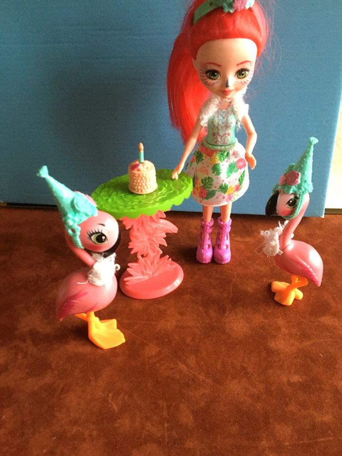 Poupée Enchantimals et ses Flamands rose La Table et son gâteau d'anniversaire Excellent état