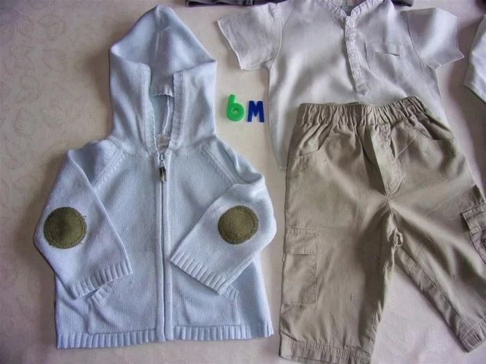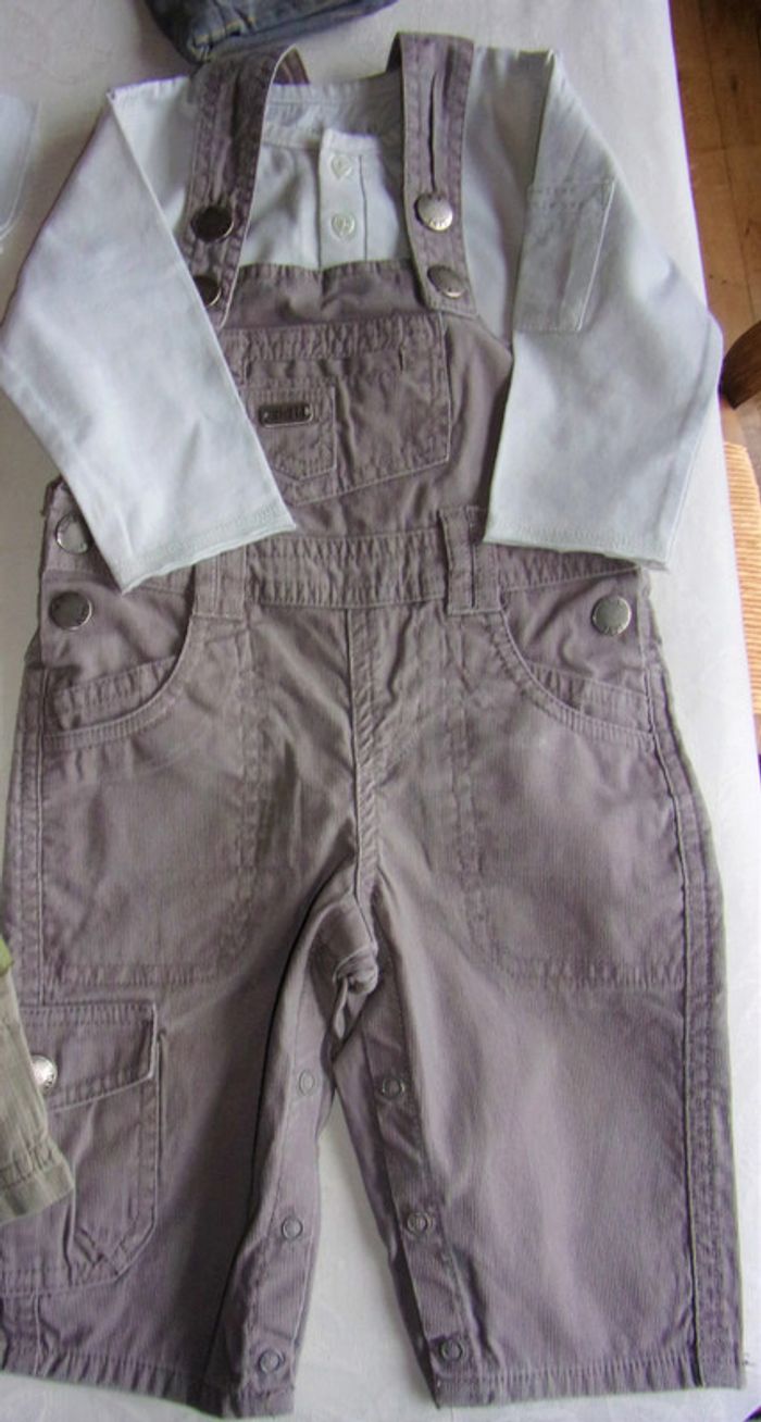 Lot vêtements garçon 6 mois 1 GILET à capuche ciel 1 ENSEMBLE chemise + pantalon 1 ENSEMBLE T.shirt +Salopette ouverture jambe le lot en excellent état