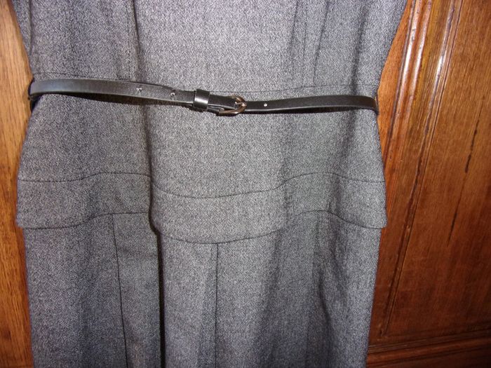 Jolie Robe CAROLL - T.38 Entièrement doublée Couleur anthracite avec empiècement noir Taille basse avec ceinture noire Base gros plis superposé par un pli formant faux ensemble Excellent état