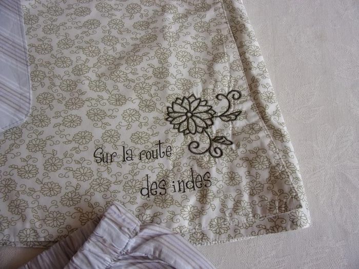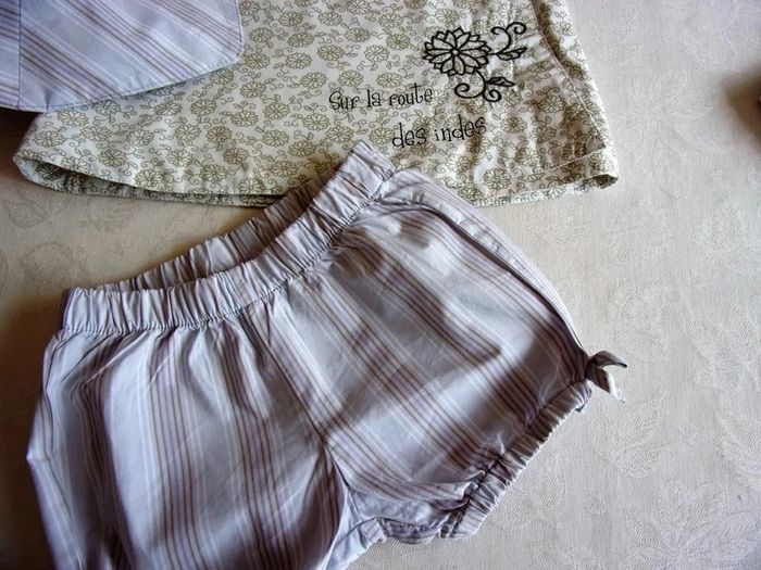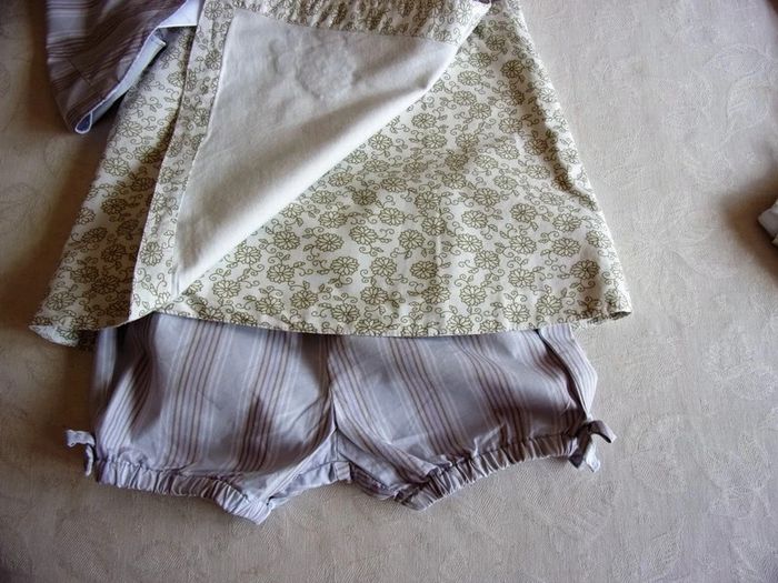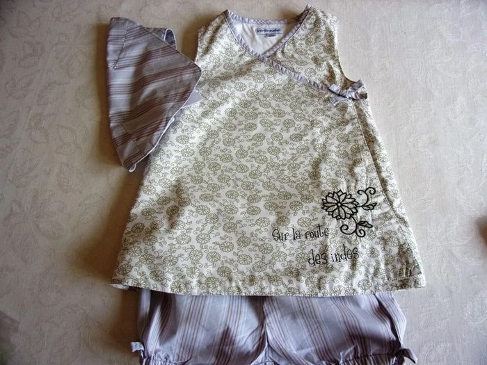 Bel Ensemble 3 pièces - petite fille 12 mois VERT BAUDET Motif " sur la route des Indes " Robe doublée forme portefeuille petites fleurs Boxer rayé assorti petits noeuds Foulard serre tête assorti Excellent état .. comme neuf