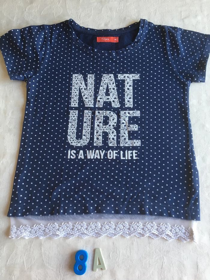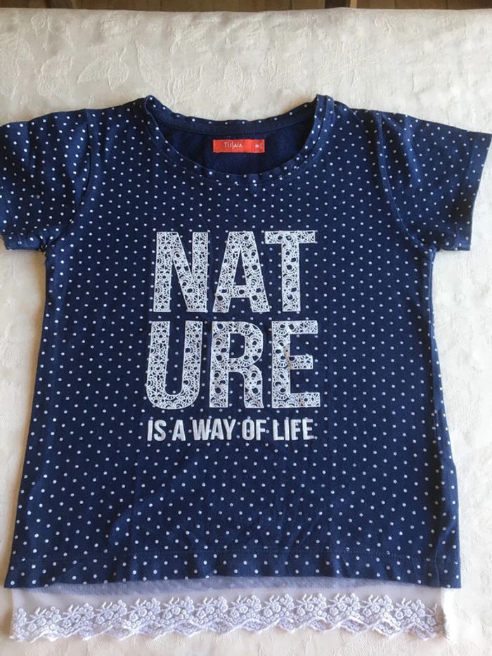 Tee shirt 8 ans Marine à pois Inscription " Nature"imprimé dentelle Base avec dentelle Tissaia Excellent état