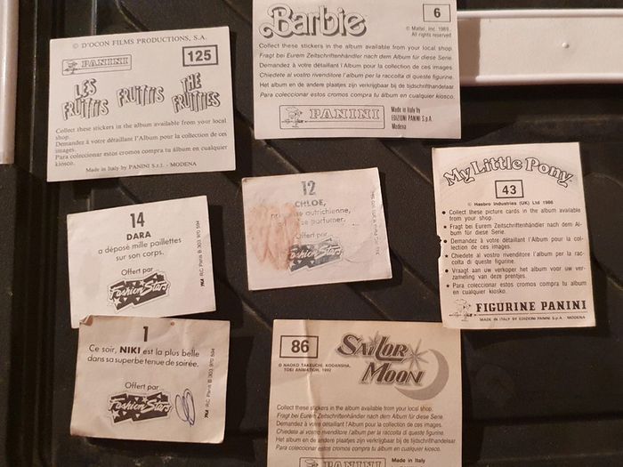 Lot comprenant 1 image Panini Sailor Moon 1 image Panini Les Fruittis 1 image Panini Barbie 1 image Panini My Little Pony (abîmée) 3 images Fashion Star (1très abîmée, 1 sale au dos) #JouetsVintage_flob76000