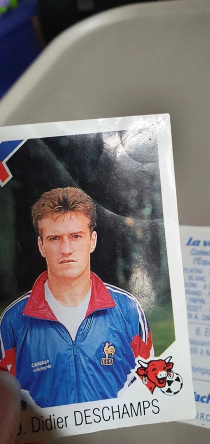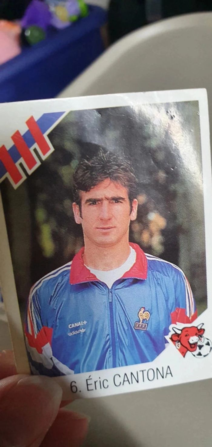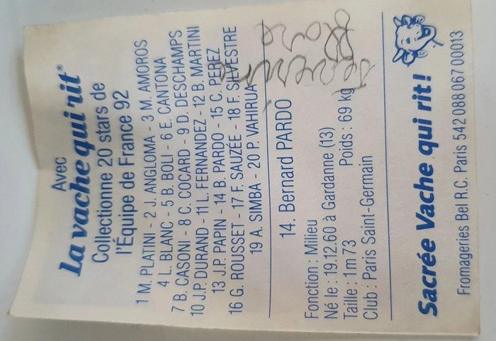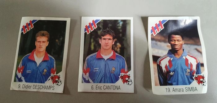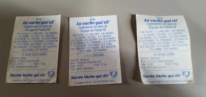 4 cartes "avec la vache qui rit collectionne 20 stars de l'équipe de France 92" : - Deschamps carte n°9 -Cantona carte n°6 -Simba carte n°19 (gondolée) - Pardo carte n°14 (gondolée et écritures crayon papier au dos) Telles que sur photos Vendues en l état #JouetsVintage_flob76000