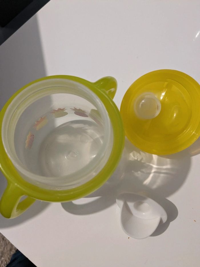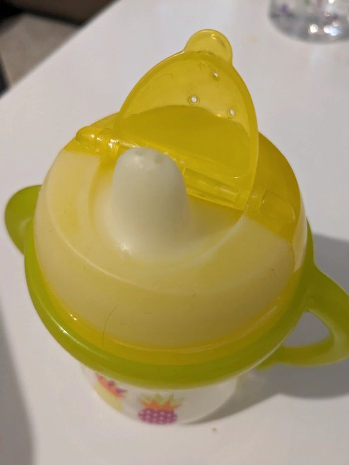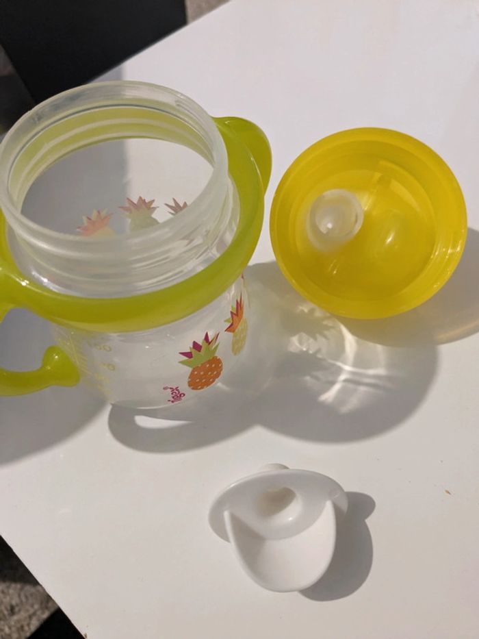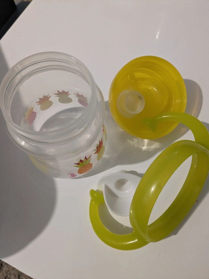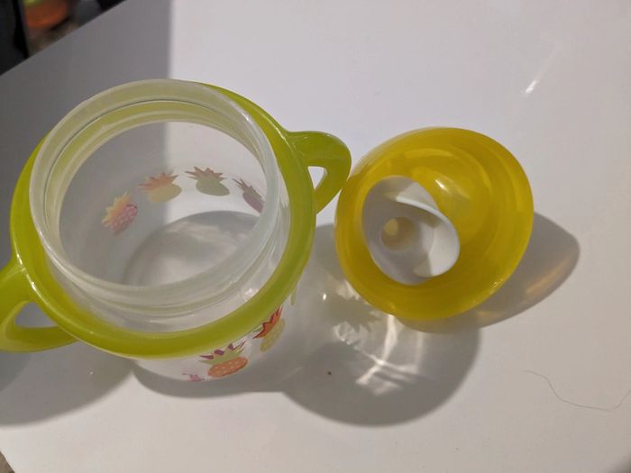 Très bon état - le petit accessoire blanc sert a empêcher l'eau de couler quand bébé retourne la tasse. Dans ce cas-là , il fait aspirer pour boire - il peut être mis ou enlevé selon l'âge de bébé