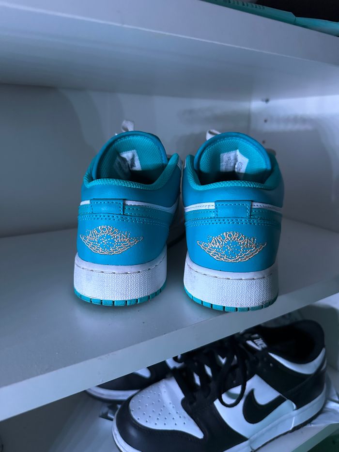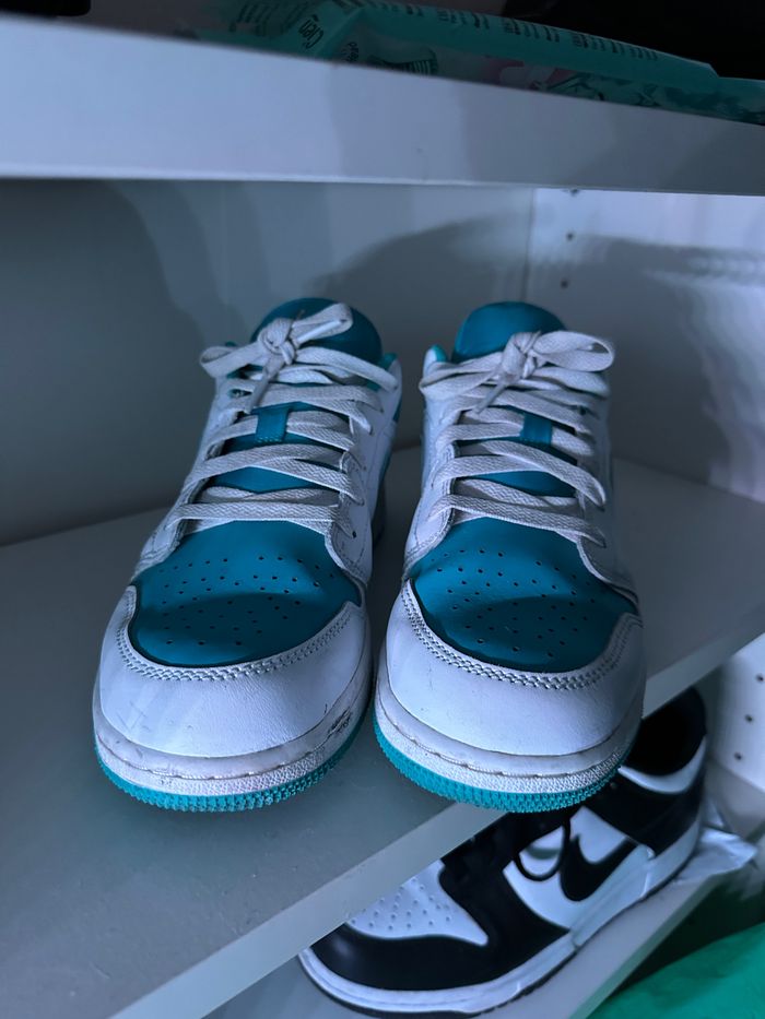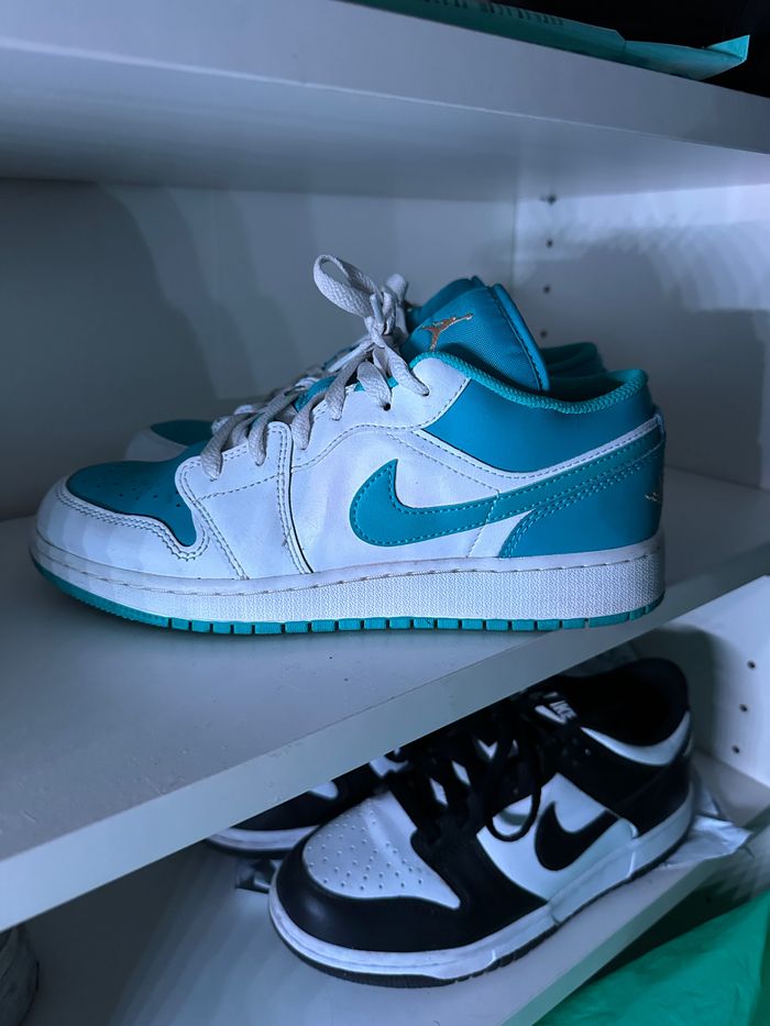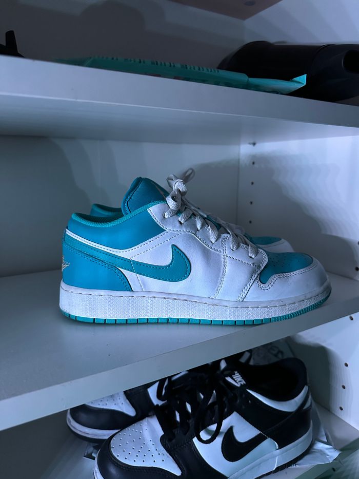 Jordan 1 Low Aquatone ( GS ) 🤍🩵 Porté quelque fois, très bon état Acheté à Courir à 110€ Taille 38.5 Je n’ai pas la boîte d’origine La paire sera nettoyé pour la vente 😄