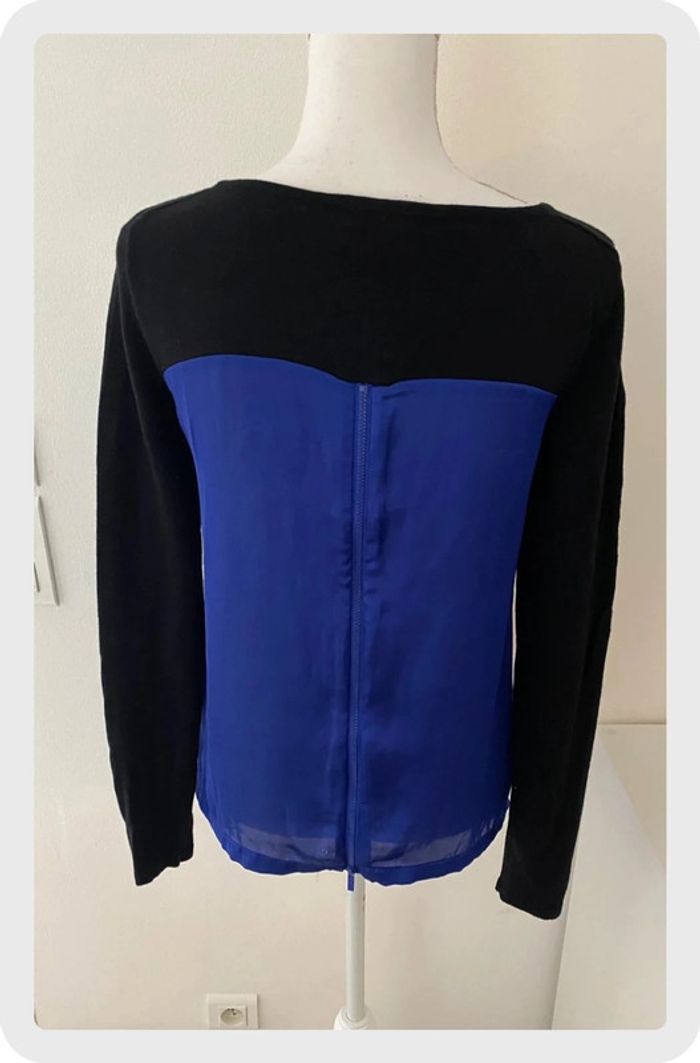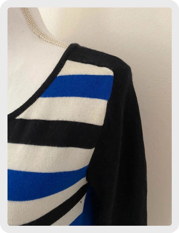 Pull style marinière rayé noir, bleu et blanc de marque Morgan. Manches unies noires, dos en satin bleu électrique avec fermeture. Taille 36. En parfait état, porte une fois. 🌸Réduction sur les lots activée, n’hésitez pas à visiter mon dressing. #ktl06taille36