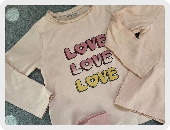 Ensemble composé : D’un haut avec inscription love de marque Vert Baudet. D’un haut manches longues rose de marque Kiabi. D’un leggings rose de marque H&M. Taille 3 ans. En parfait état. 🌸Réduction sur les lots activée, n’hésitez pas à visiter mon dressing. #ktl06enfant3ans #ktl06enfant36mois