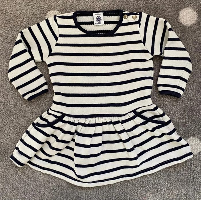 Iconique robe marinière de marque Petit Bateau. Rayures blanches et marine. Taille 12 mois. En très bon état. 🌸Réduction sur les lots activée, n’hésitez pas à visiter mon dressing. #ktl06enfant12mois #ktl06petitbateau