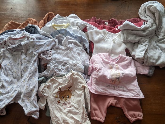 Lots vêtements 0-1 mois : - 6 pyjamas 0 mois - 11 bodies naissance - 3 bodies 1 mois - 3 gilets 1 mois - 1 tee shirt 1 mois - 1 pantalon 1 mois - 2 vestes 1 mois