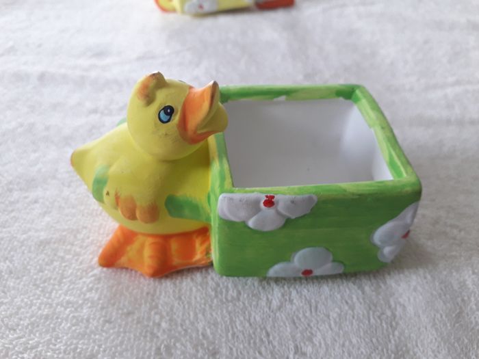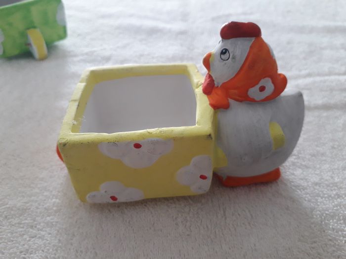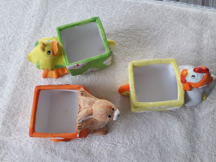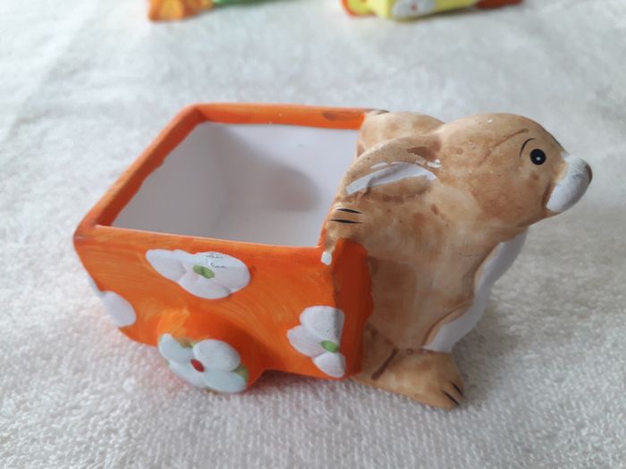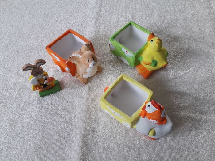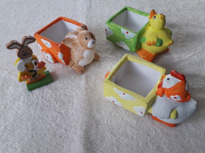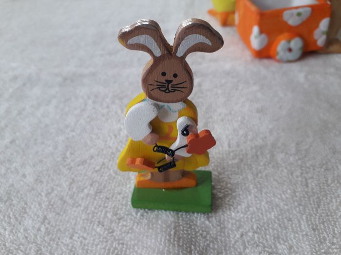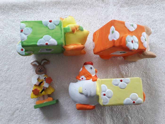 lots de 4 décors de Pâques à poser 3 décors a poser Lapin avec brouette dim : 10cm x 7cmx7cm de hauteur Canard avec brouette dim : 12cm x 6cm x 7cm de hauteur Poule avec brouette dim : 12 x 6cm x 7cm de hauteur Un lapin en bois dim : 8cm x 4cm Vendu en l’état comme sur les photos