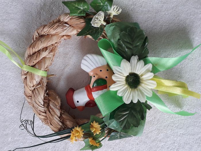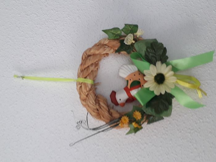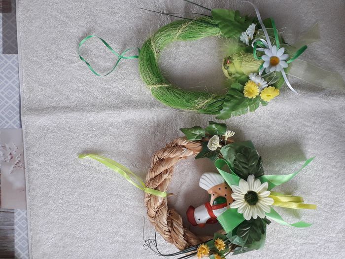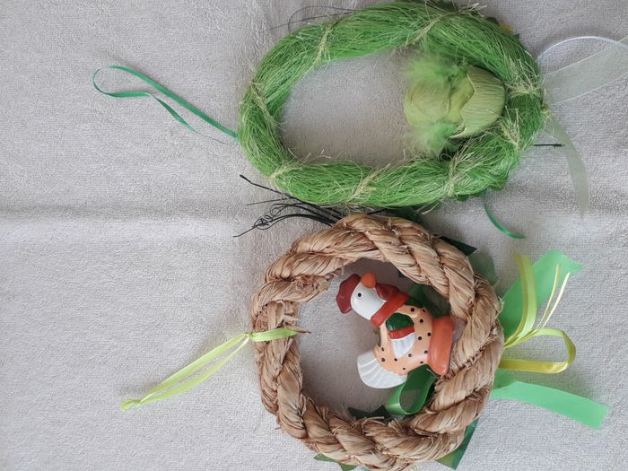 Lots de 2 suspensions de Pâques une couronne décors poule dim : 18 cm x 18cm une couronne décors poussin dim 22cm x 14.5cm vendu en l'état comme sur les photos