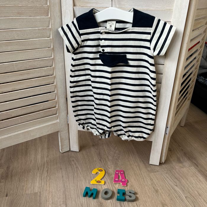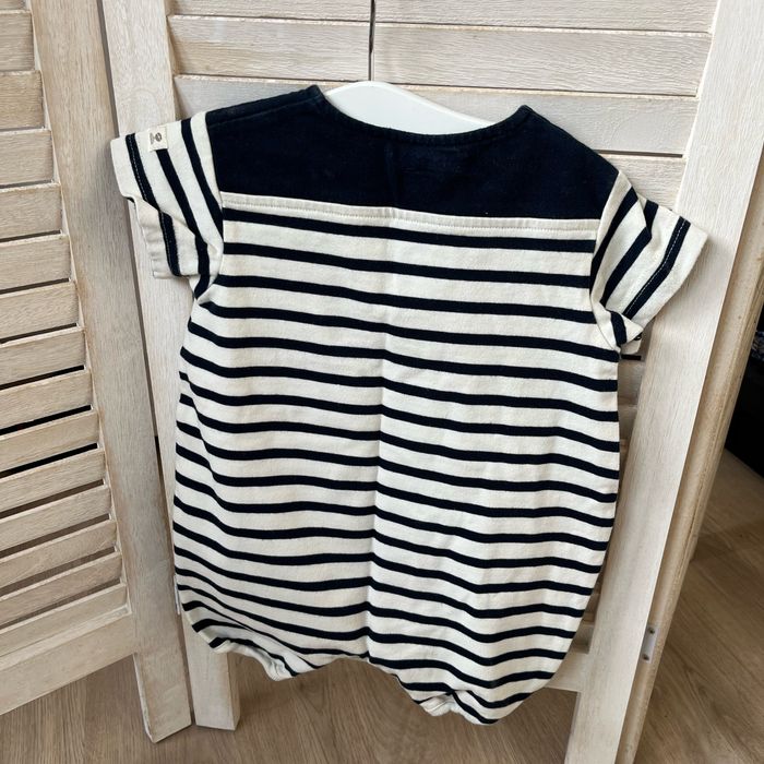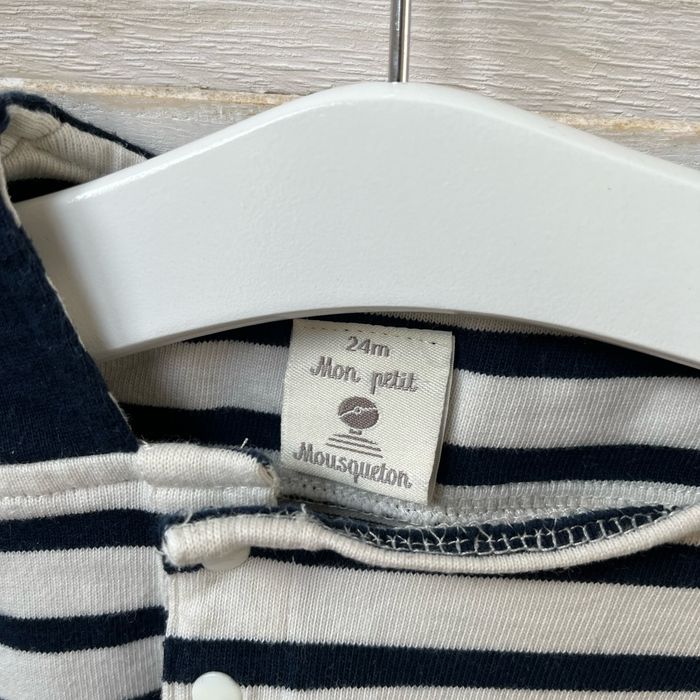 Barboteuse de la marque Mousqueton Il manque une pression sur le bas, mais ne gêne en rien le port du vêtement. Rayures, bleu marine et beige Penser à faire un lot pour bénéficier de la réduction et économiser sur les frais de port
