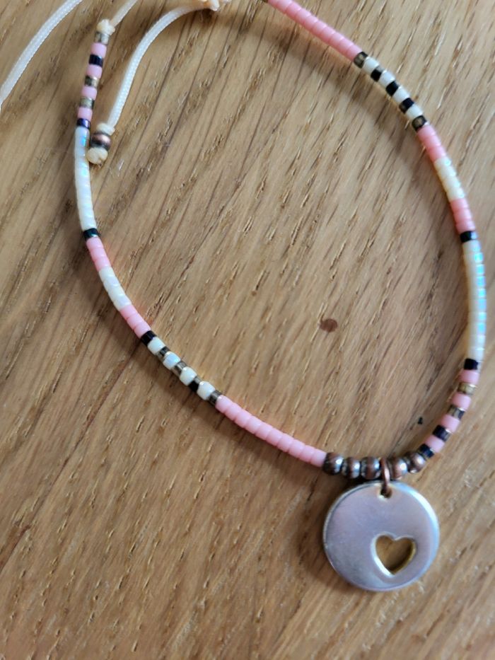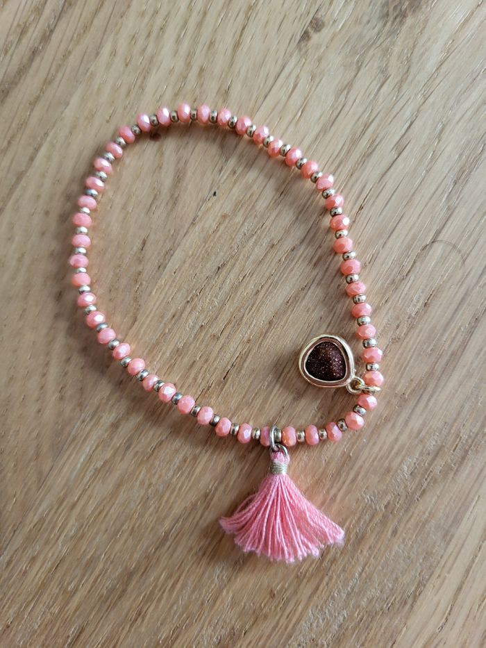 Ensemble de 2 bracelets ⁃ 1 bracelet élastiqué avec des perles de focaille couleur corail et dorées ainsi que 2 breloques (un pompon et une fausse pierre), comme neuf ⁃ 1 bracelet ajustable avec des perles de rocaille dans les tons rose et un pendentif cour argenté, porté mais sans défauts