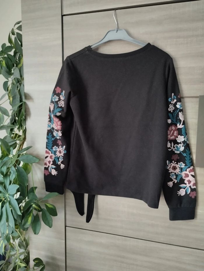 Pull noir avec des fleurs sur les bras et on peut faire un nœud en bas Taille 12 ans Marque Kiabi Très bon état