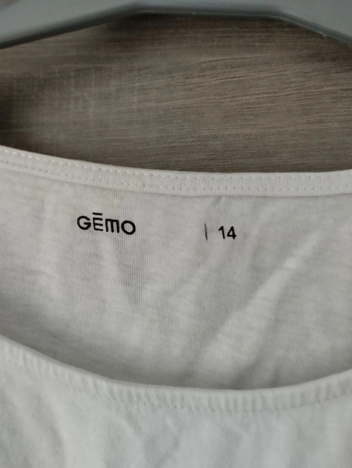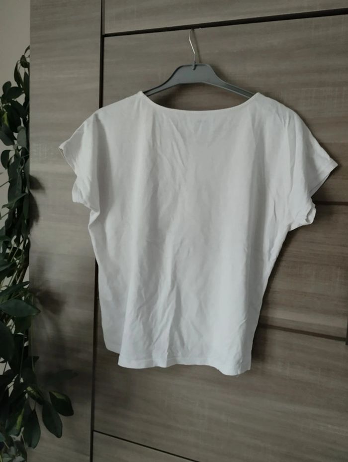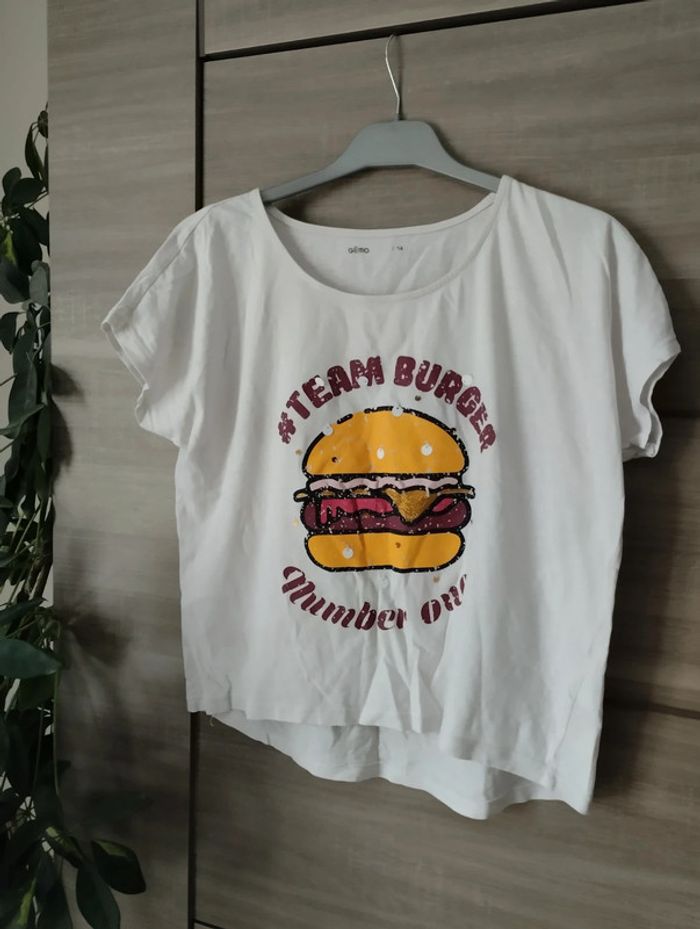 T-shirt court manches courtes blanc avec un hamburger (n'est plus très blanc à cause du lavage) Taille 14 ans Marque Gémo
