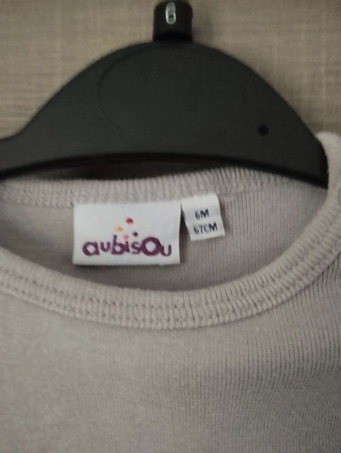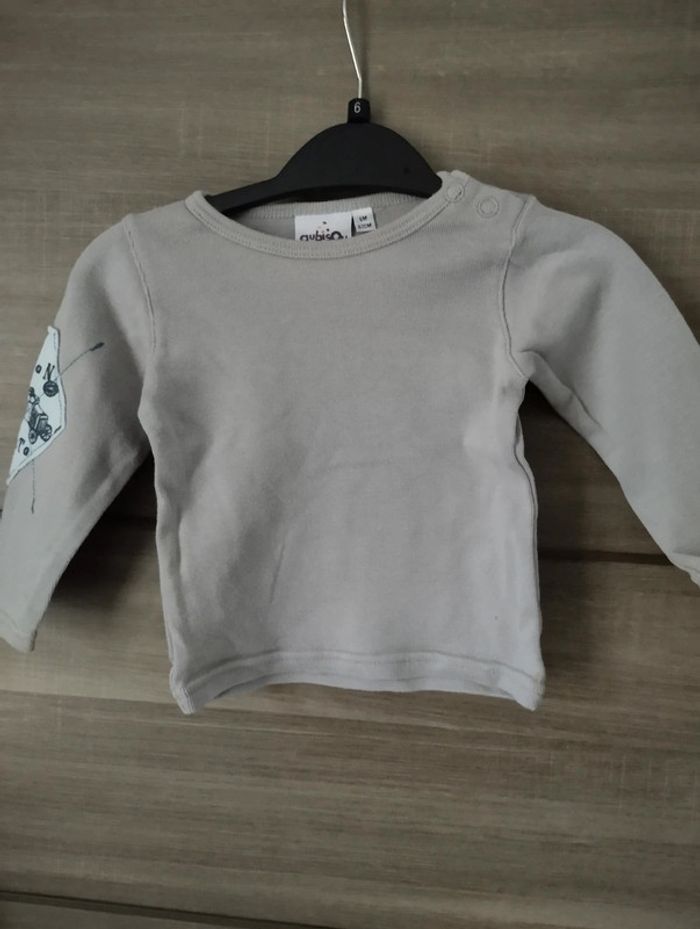 T-shirt manches longues gris avec un motif sur le bras droit Taille 6 mois Marque Aubisou Très bon état