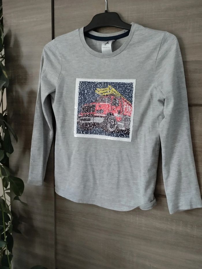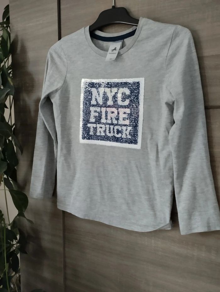 T-shirt manches longues gris sequin réversible. Un côté avec un camion de pompier et l'autre côté inscription "NYC Fire Truck" Taille 7 ans Marque C&A Très bon état