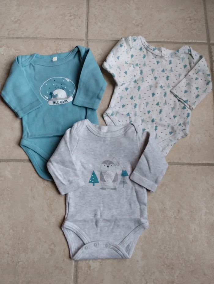 Lot de 3 bodies (donc 1 avec une petite tâche voir photo n°3 donc je le donne) Taille 3 mois