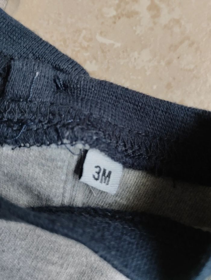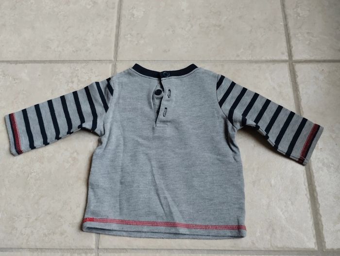 T-shirt manches longues gris avec des rayures bleues et deux boutons dans le dos 3 mois Très bon état