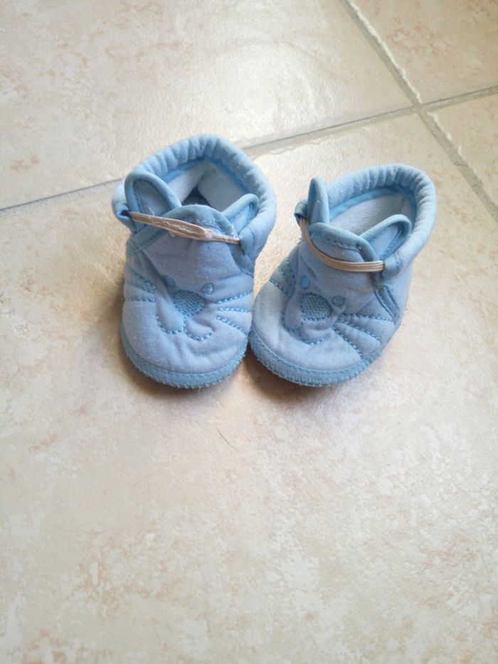 Chaussons bébé Coloris bleu Taille 0-3 mois Le chausson tient au pied de bébé grâce à un élastique Peu porté