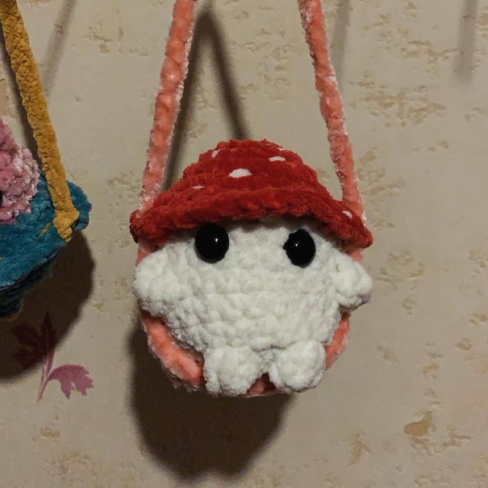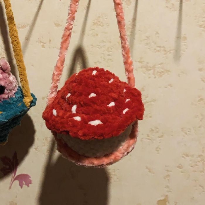 Décoration de rétroviseur baby muschroom sur une balançoire fait au crochet en laine chenille