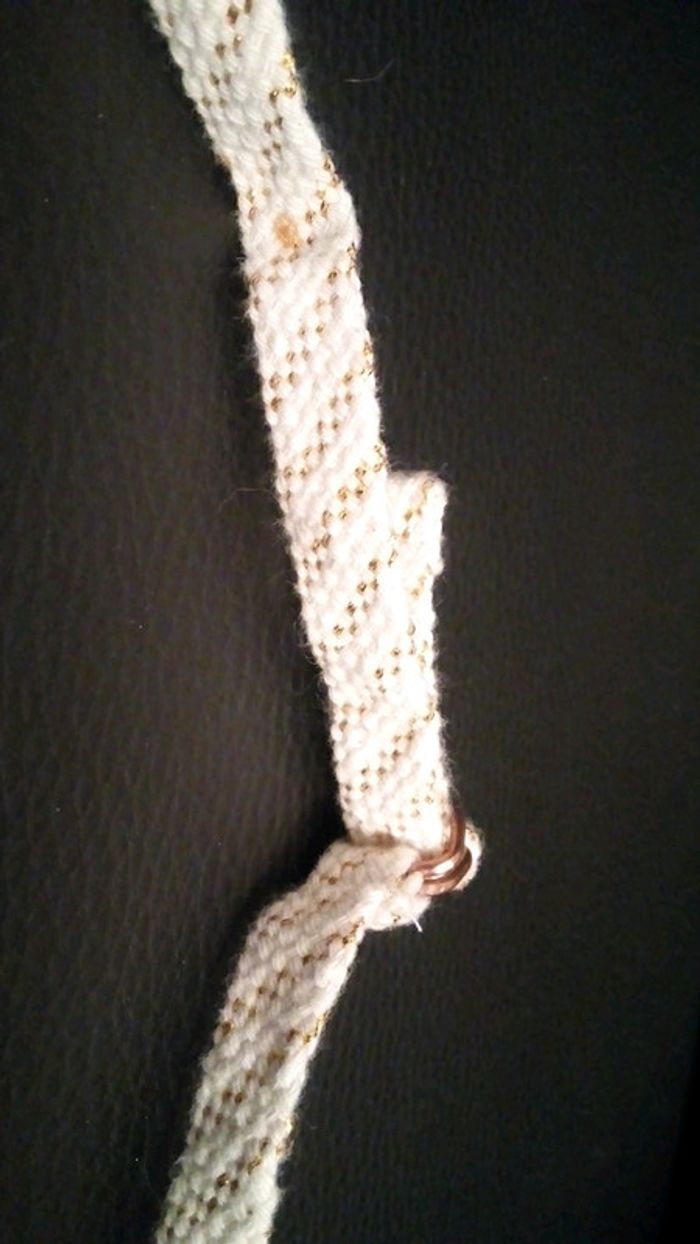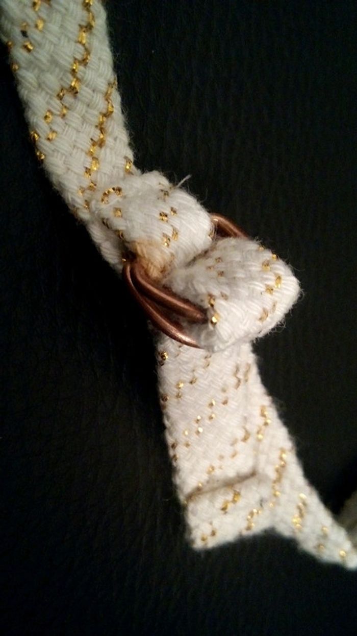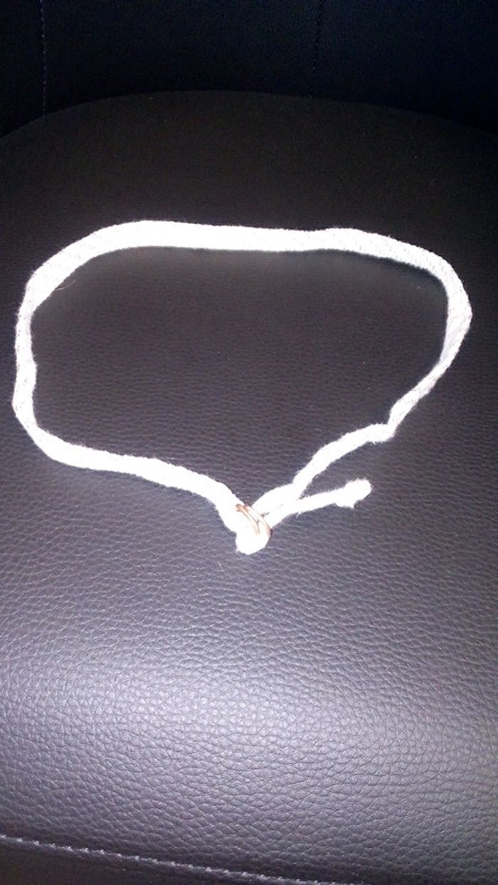Petite ceinture blanche/dorée. Jamais servie. 2 petites tâches (effet rouille) : 1 à l'intérieur, 1 au niveau de l'attache. Ne se remarque pas. Vour photos