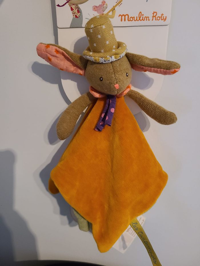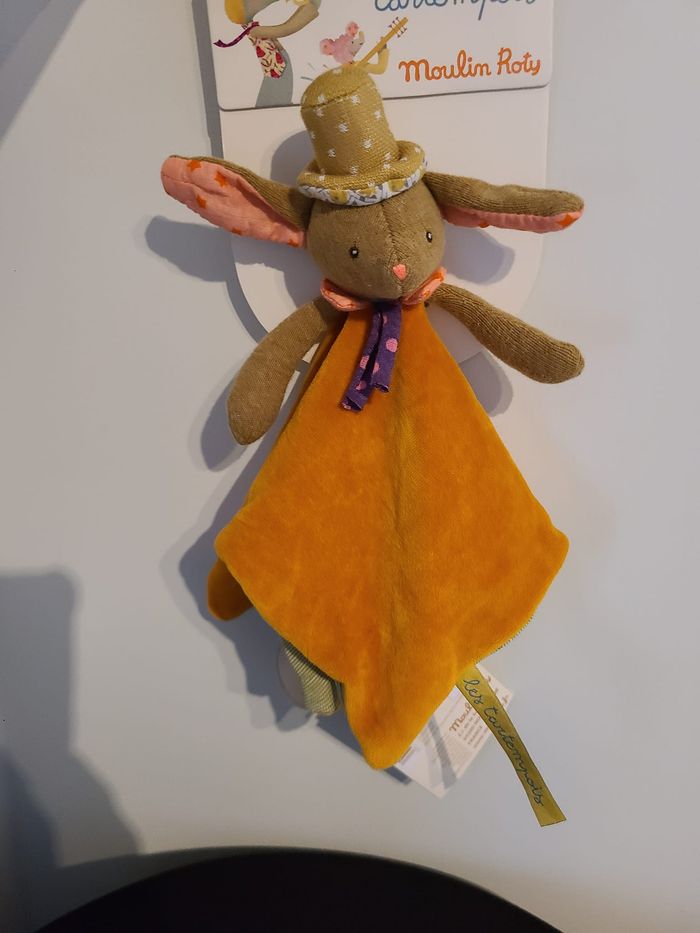 DOUDOU PLAT MOULIN ROTY LES TARTEMPOIS SOURIS LAPIN ORANGE/ VERT CHAPEAU