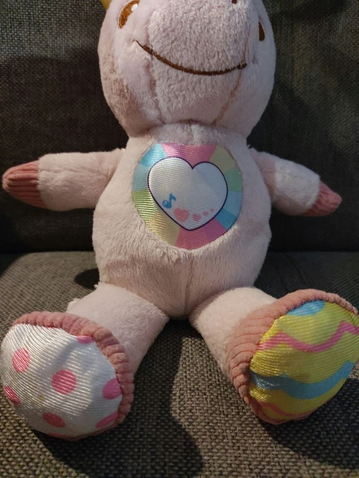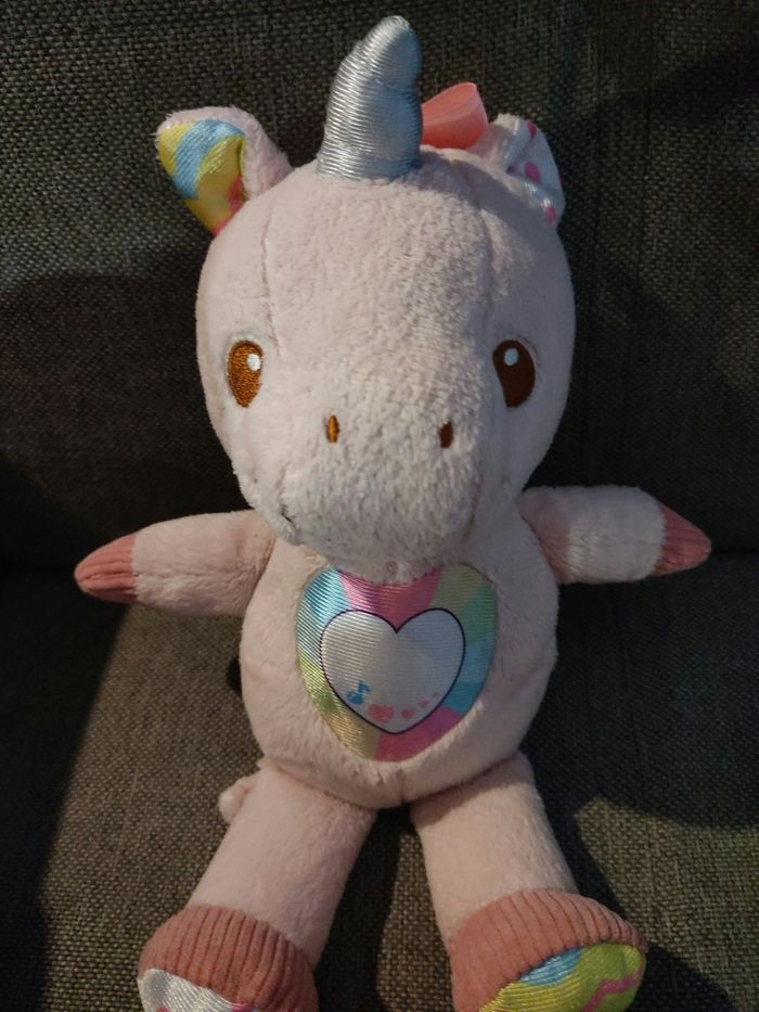 Maé, ma licorne à câliner est parfaitement adaptée à la taille de votre enfant pour qu’il puisse la prendre dans ses bras et la câliner. Les douces chansons et mélodies l’aident à s’apaiser. Les couleurs tendres et les lumières colorées l’emportent dans un univers bienveillant et rassurant tandis que les phrases et les chansons éveillent sa curiosité. De nombreuses matières à toucher (papier bruissant, corps souple et corne argentée) 45 chansons, mélodies, sons et phrases Réglage du volume sonore et arrêt automatique Retirer le module électronique pour nettoyer la peluche à la main et en surface. Apprentissages Développement de la motricité Développement du langage Découvertes et exploration En très bonne état.