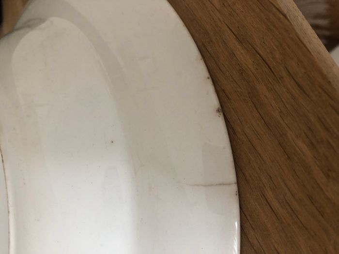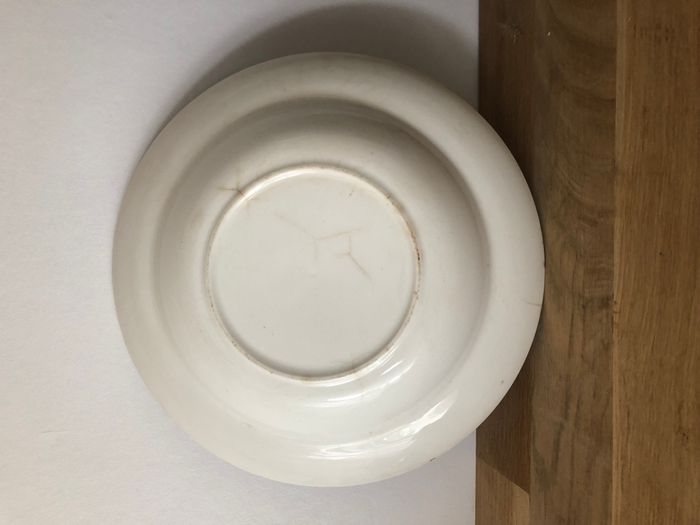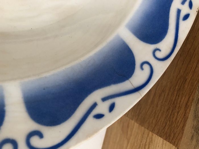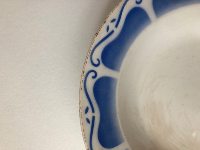 Vintage joli plat creux en faïence (style Gien?) Arabesques bleus 25.5 cm de diamètre et 5 cm de hauteur En état satisfaisant : porte les traces du temps : bien regarder les photos = vendu en l'état