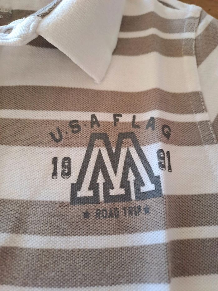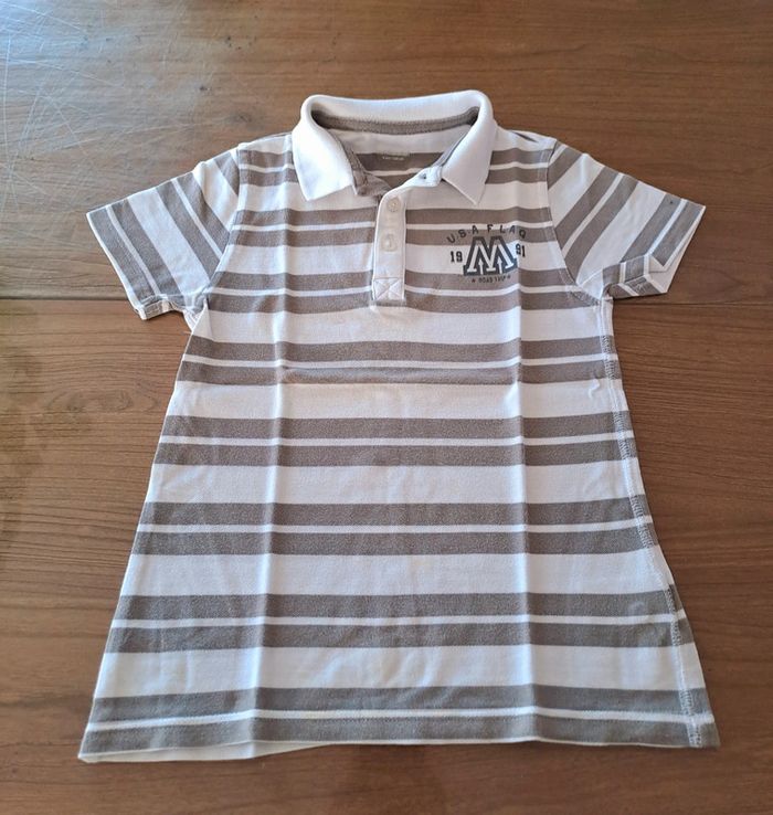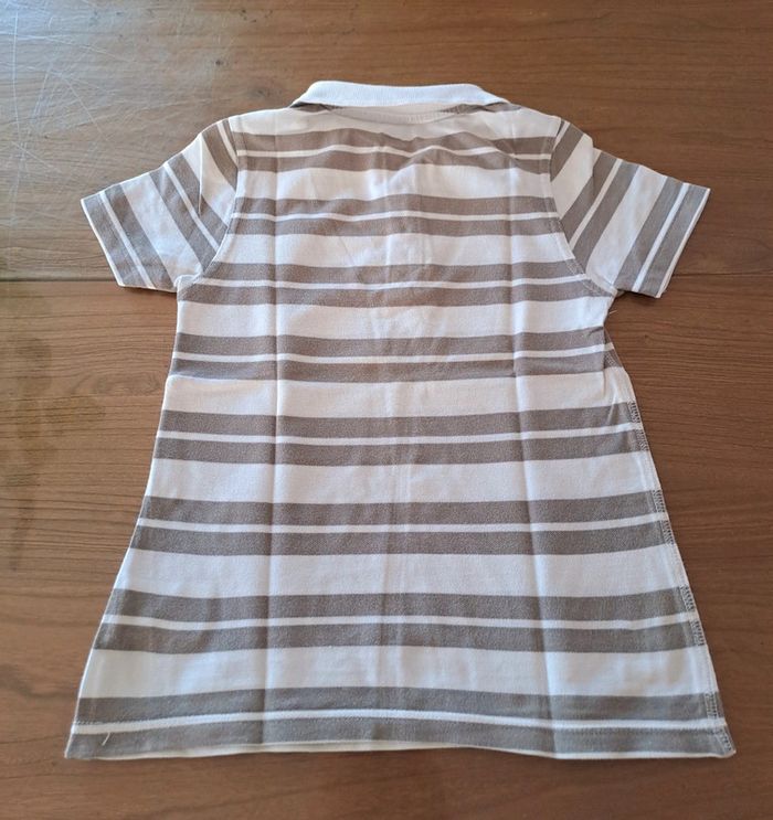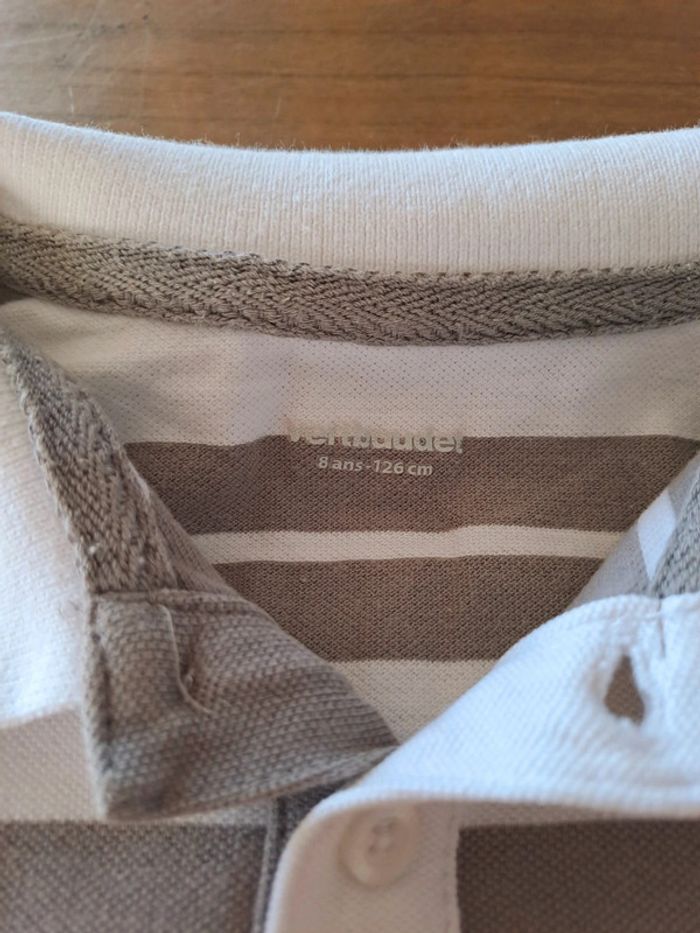 Polo manches courtes Vert Baudet Blanc à rayures grises Taille 8 ans 100% coton Quelques ombres jaunes en bas du polo mais très peu visibles (voir dernière photo mais on ne les voit pas...) #polo8ansgarcon #vertbaudet #usa #ciya76vêtementsgarçon8ans