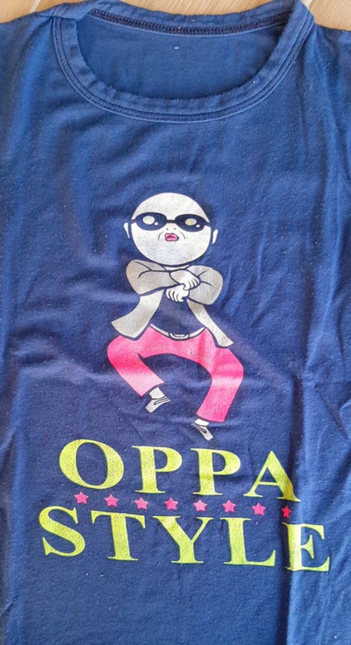 Tee-shirt Gangnam Style Étiquetté 6 ans mais taille plutôt 5 ans Très fluide Bien porté ; bouloché ; dessin craquelé #teeshirtgangnamstyle5ans