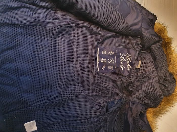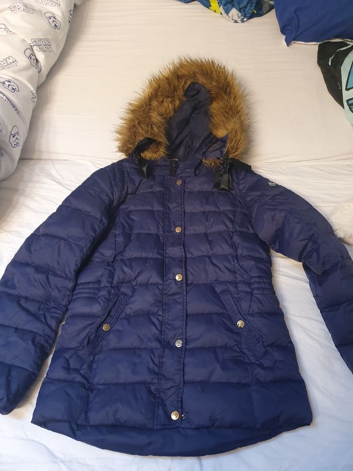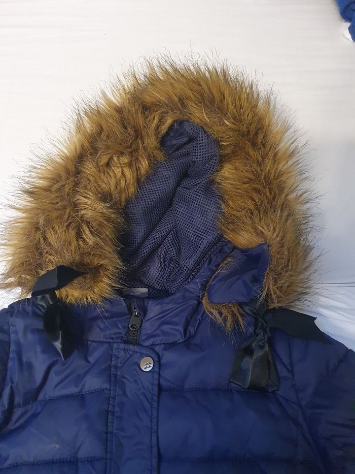Belle veste doudoune Baker Bridge bleue marine bien chaude avec fourrure autour du capuchon et belle finition avec 2 petits nœuds de satin taille 14 ans. Légèrement boulochee du au frottement à l intérieur et bas de la veste